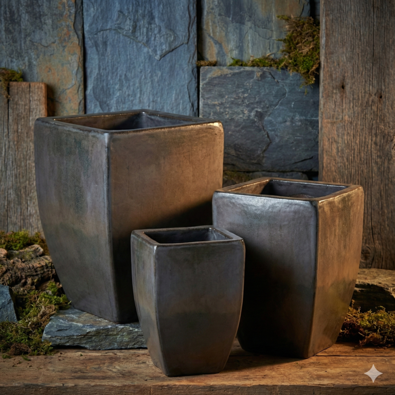Tapered Square Geometry: Each pot maintains a consistent square-top architectural form with clean, sloping lines that provide a contemporary take on the classic planter box.