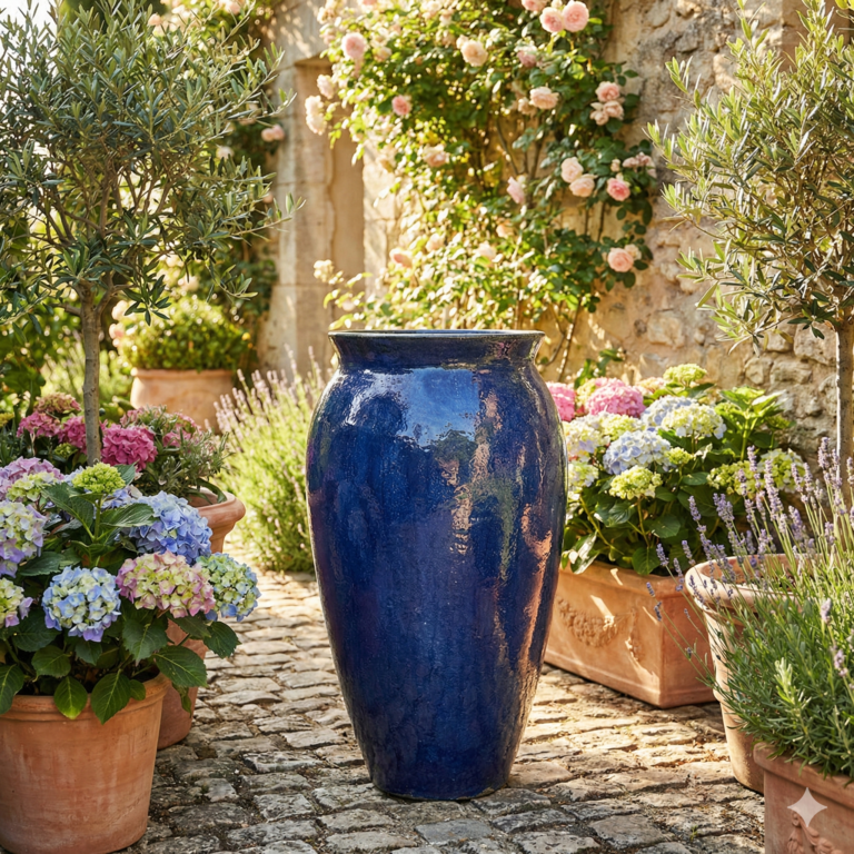 Dual-Tone Gradient Glaze: Features a brilliant high-gloss cobalt finish with a reactive-style dark drip rim, offering a unique, artisanal aesthetic that complements both modern and traditional landscapes.