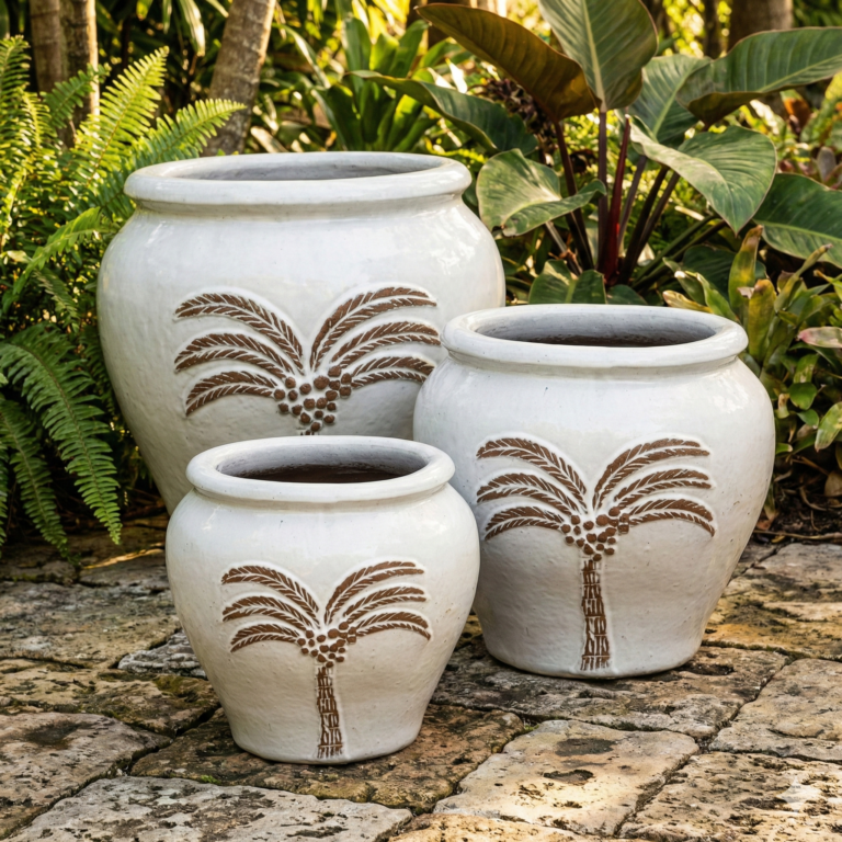 Dimensional Relief Artistry Each planter is embellished with raised decorative motifs—a central rosette medallion and flowing textural swags. These features add physical depth and a sophisticated tactile quality to the vessel’s surface, ensuring the set looks impressive from every angle.