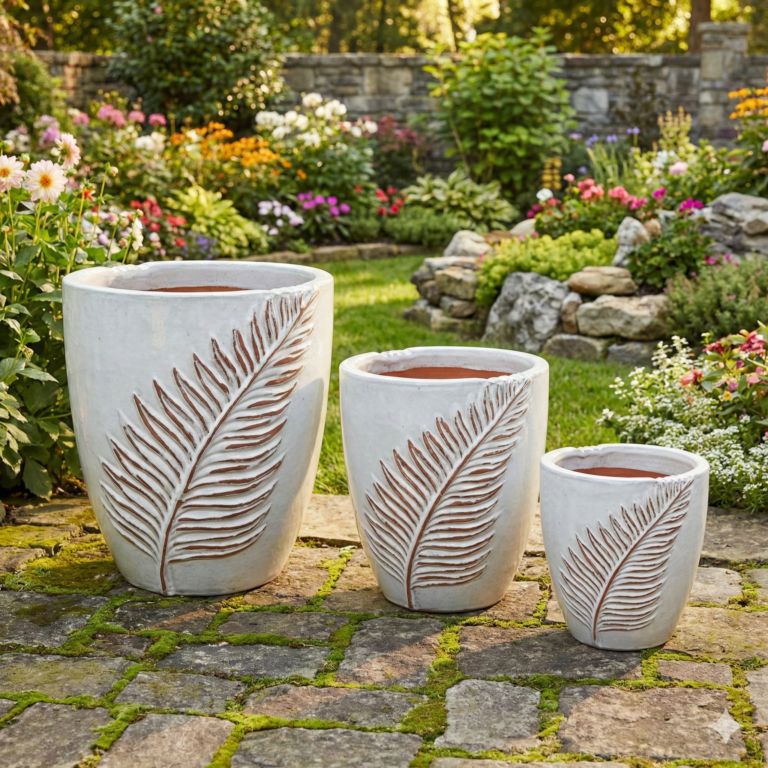 Hand-Carved Botanical Relief: Each planter is adorned with a deep, textured fern frond design, adding a layer of sophisticated dimension and an organic feel to your plant display.