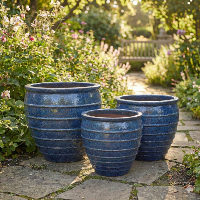 Artisanal Glazed Finish: Each planter boasts a rich, multi-tonal cobalt blue finish with a contrasting terracotta-hued interior and rim, providing a high-end, weather-resistant aesthetic that shines in natural light.