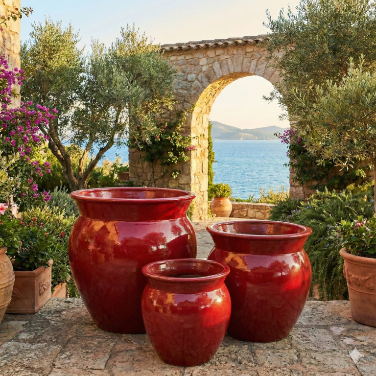 High-Luster Glazed Finish: The premium protective glaze creates a brilliant, reflective surface that enhances the vessel's curves while offering resistance against weather and wear.