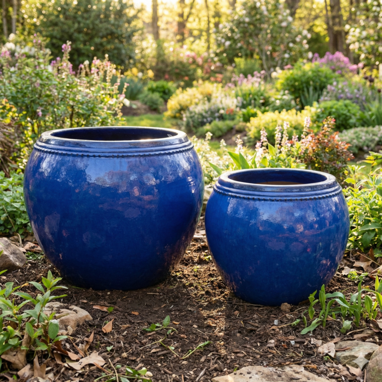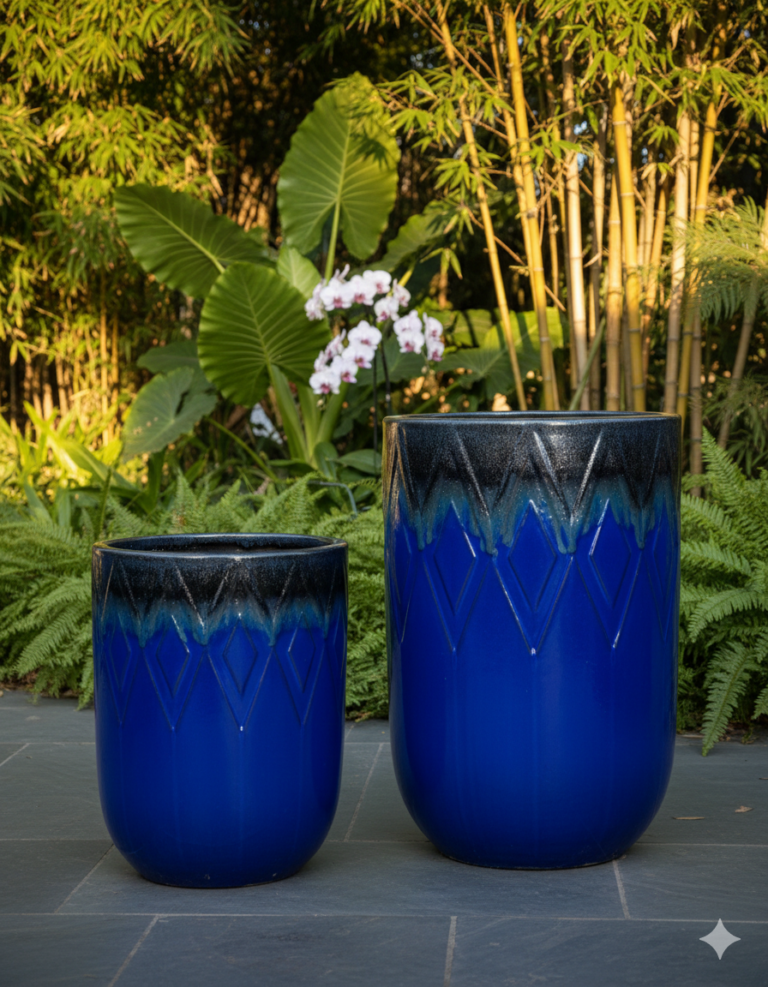 Dual-Tone Gradient Glaze: Features a brilliant high-gloss cobalt finish with a reactive-style dark drip rim, offering a unique, artisanal aesthetic that complements both modern and traditional landscapes.