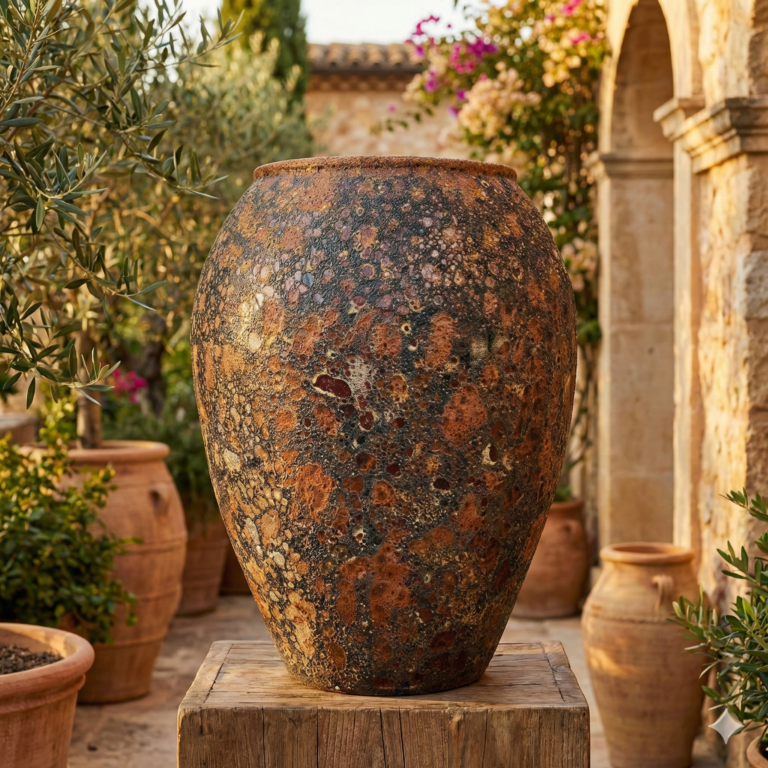 Heavily Pitted Rustic Finish: The deeply cratered surface and earthy, multi-layered glaze provide an authentic, weathered aesthetic with exceptional tactile quality.