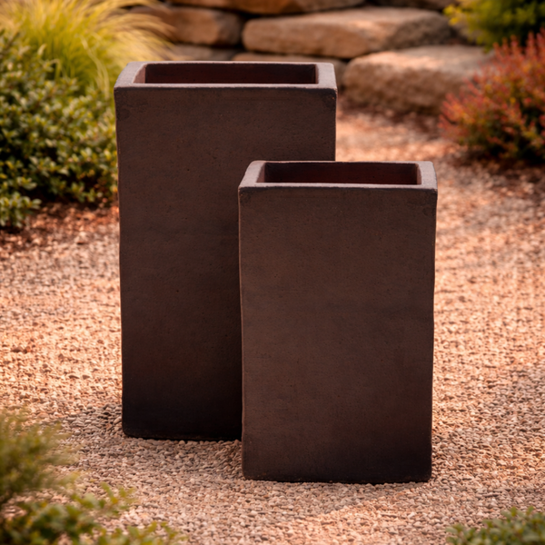 A tall square planter crafted from black clay with a smooth matte finish. Its vertical profile and clean, architectural lines make it ideal for framing entryways, patios, and walkways, adding height and modern structure to outdoor spaces.