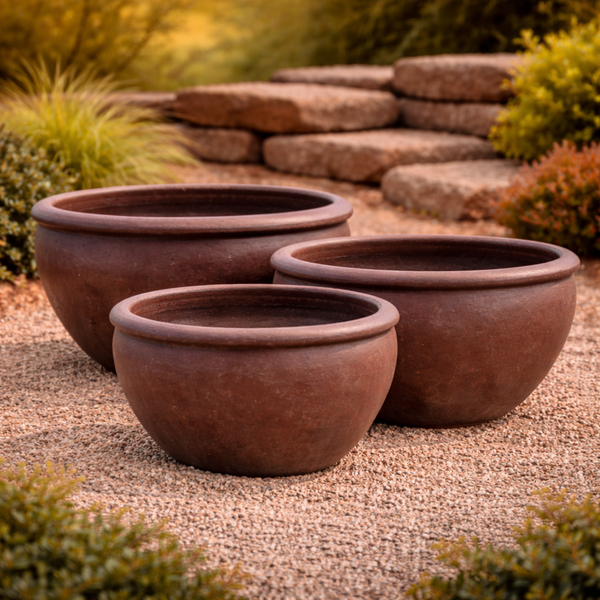 A wide, low-profile planter crafted from black clay with a smooth matte finish and subtle rolled rim. The rounded bowl shape creates a grounded, sculptural look, making it ideal for succulents, florals, and shallow-root plants in gardens, patios, and outdoor living spaces.