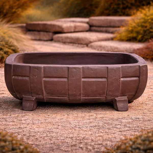 The Black Clay Wine Tank Planter features a bold, low-profile silhouette inspired by traditional wine fermentation tanks. Its raised feet and carved panel detailing add architectural interest while allowing airflow beneath the planter. Crafted from durable black clay, this piece is ideal for showcasing succulents, bonsai, herbs, or shallow-root plants in modern and rustic outdoor spaces.