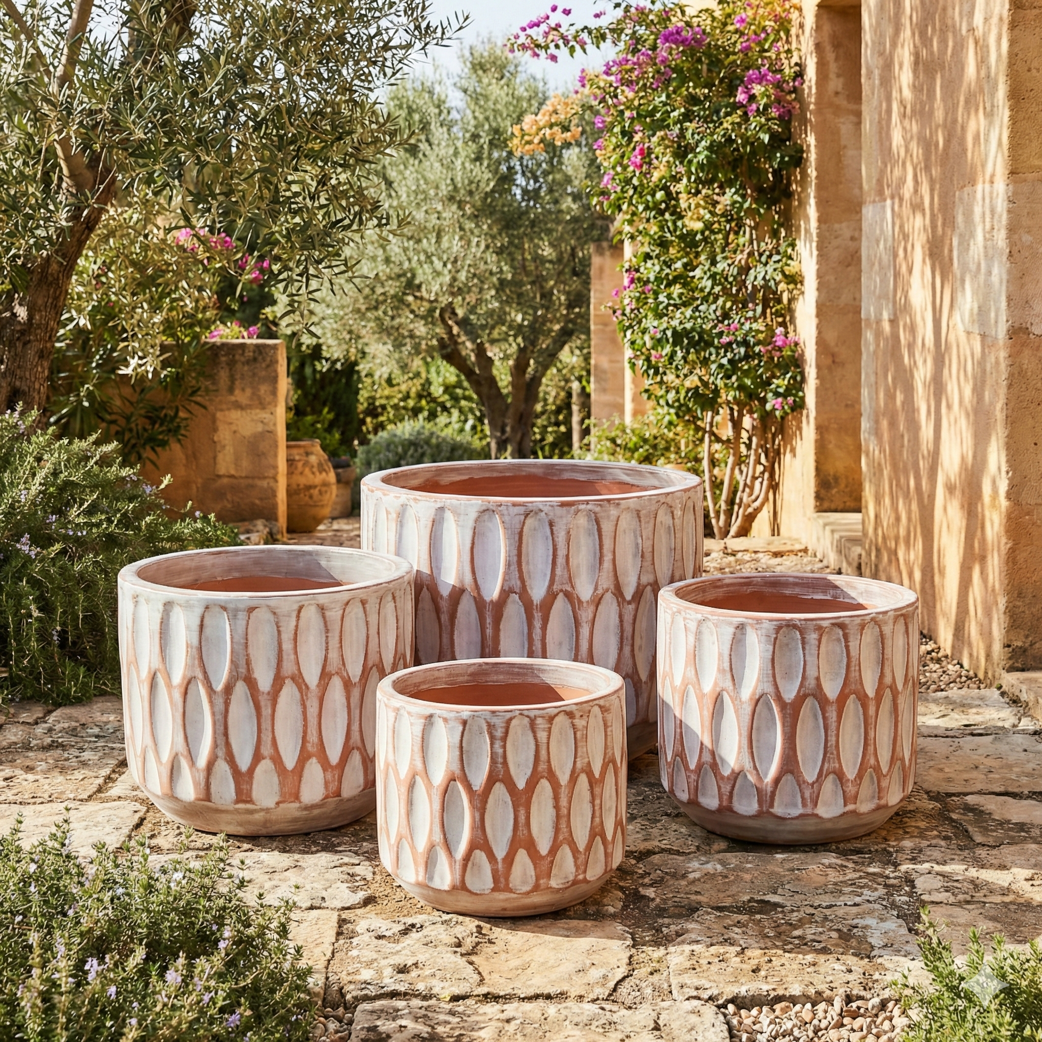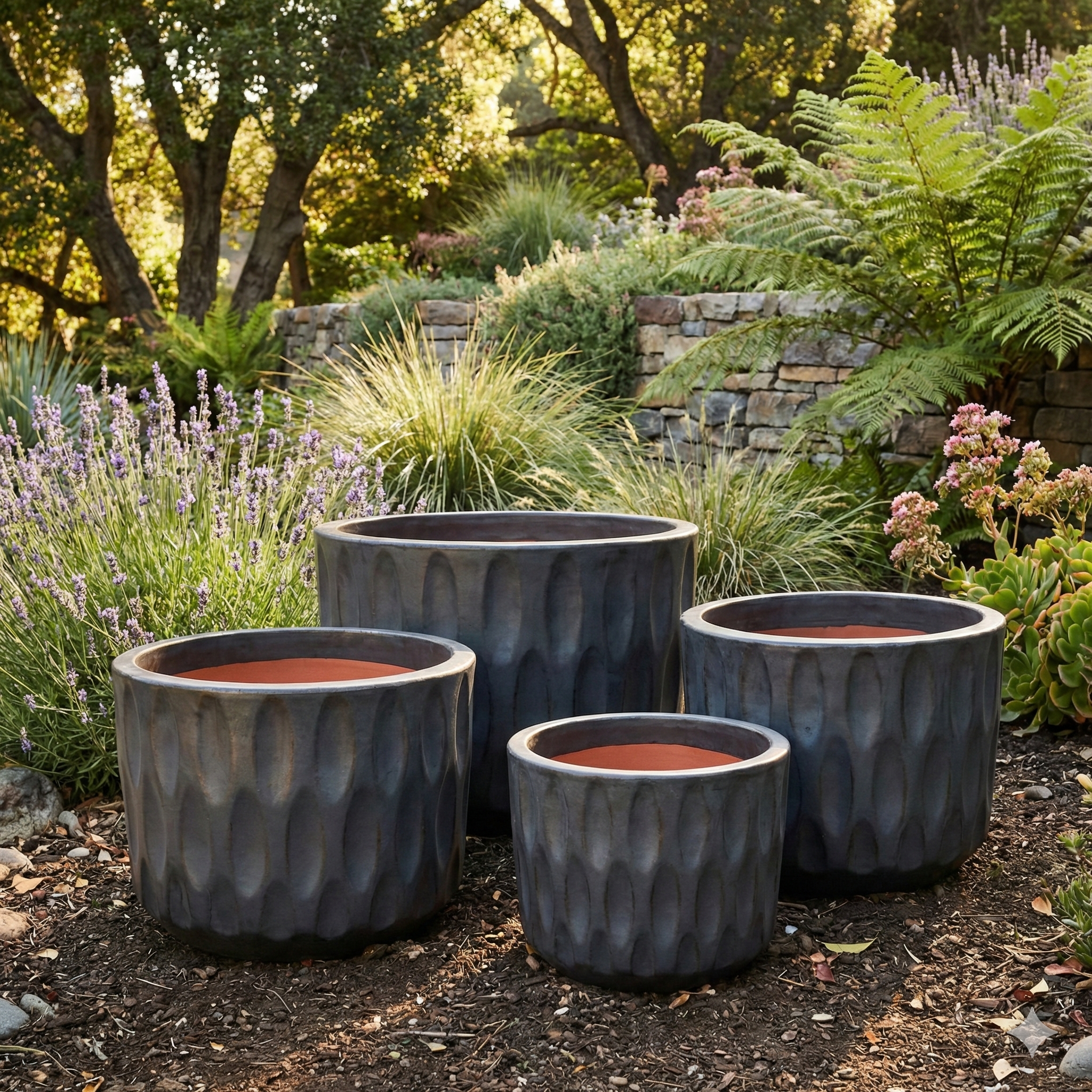 This set of four graduated planters offers a sophisticated way to add architectural depth to your greenery. Defined by their sturdy, drum-like silhouettes and rhythmic surface textures, these vessels are designed to transition seamlessly between modern minimalist and rustic environments. The staggered dimensions make them ideal for creating a tiered botanical display or anchoring different corners of a patio with a unified design language.