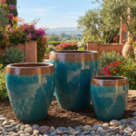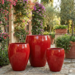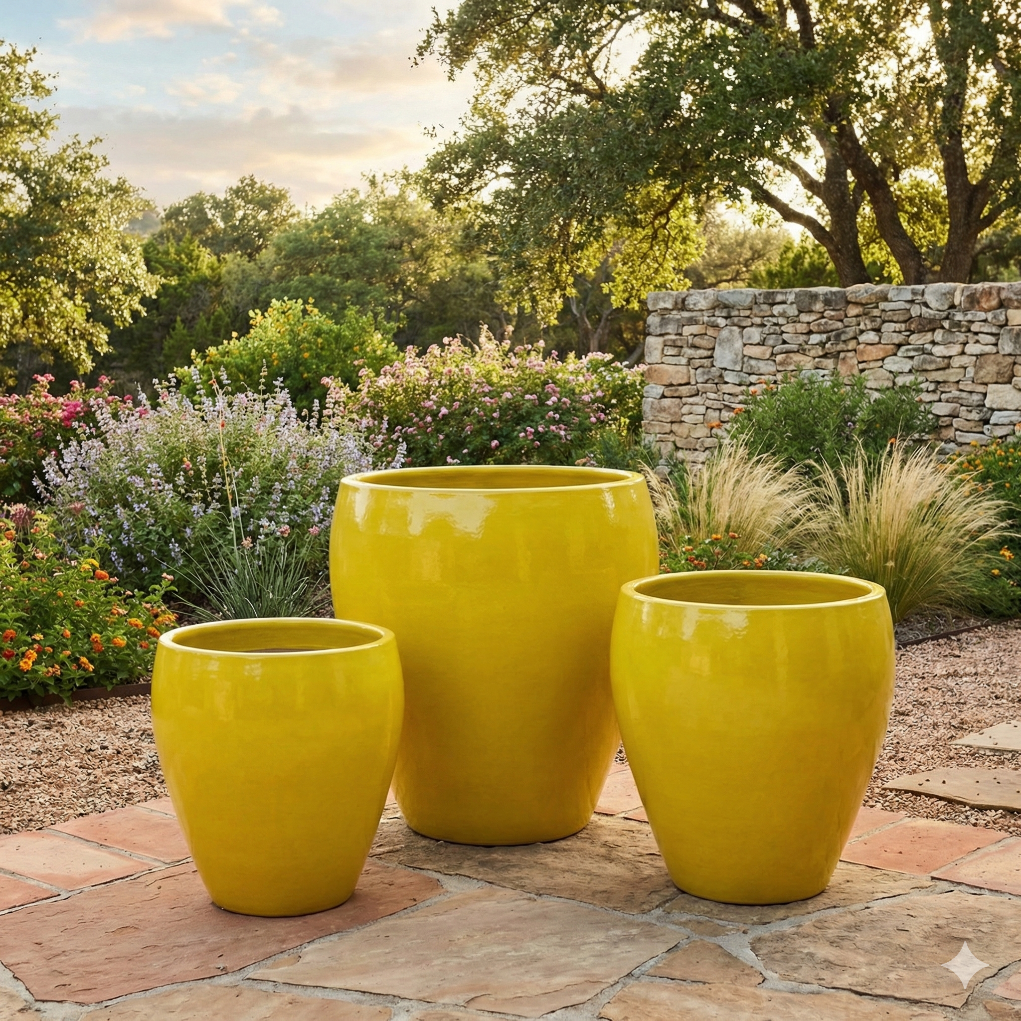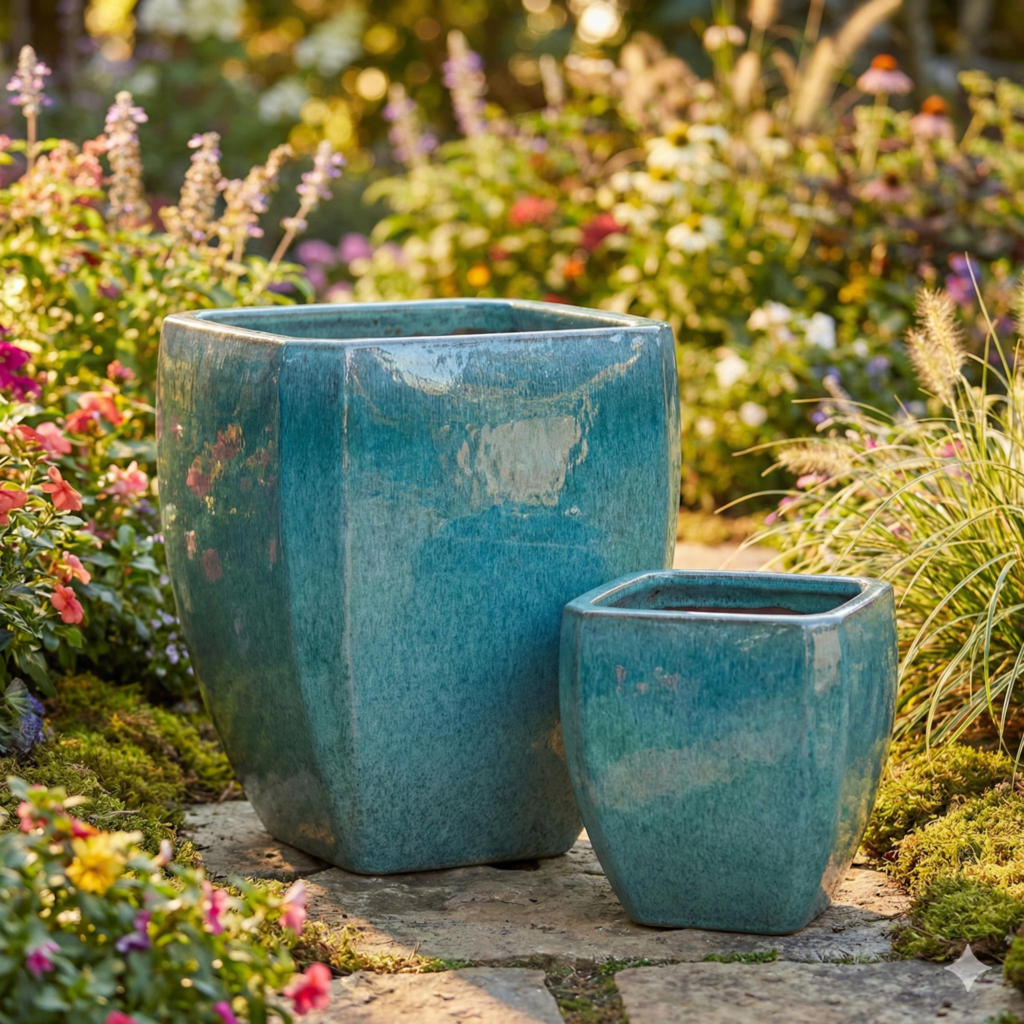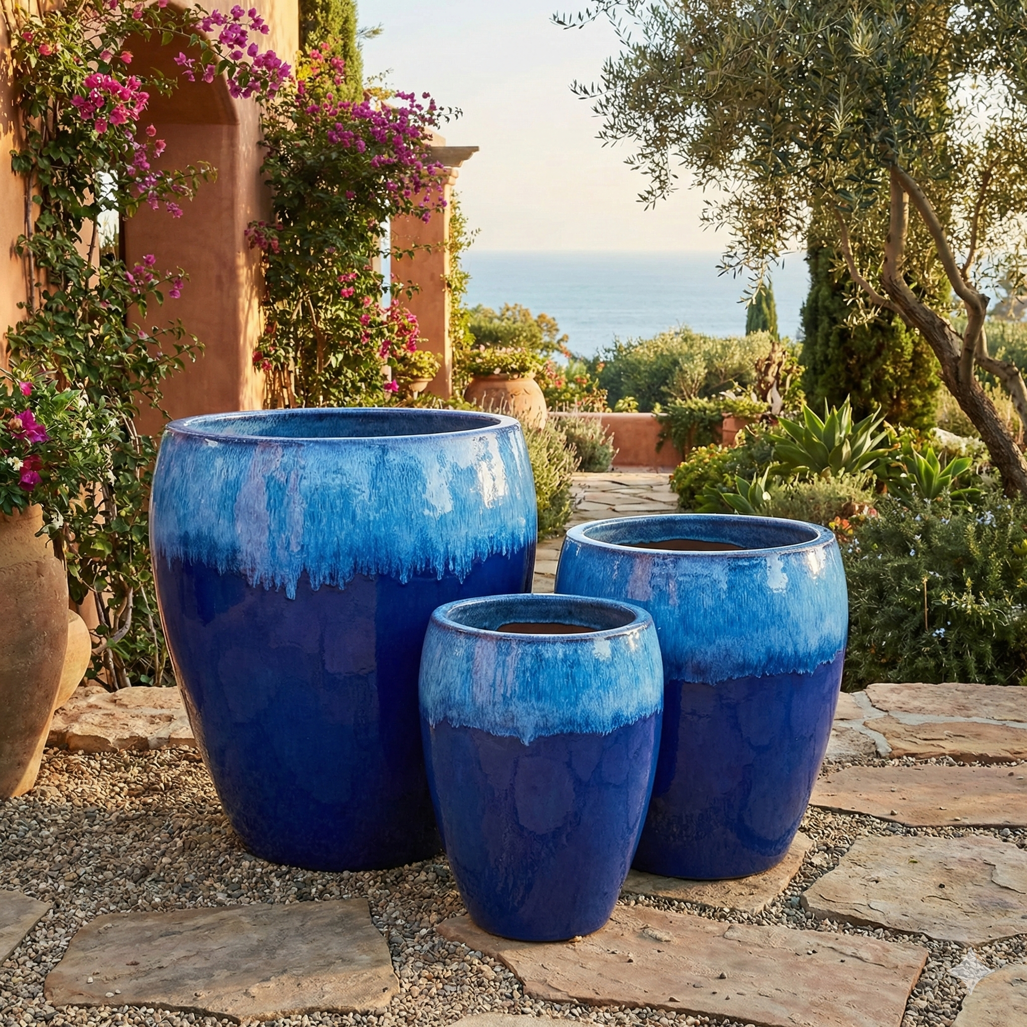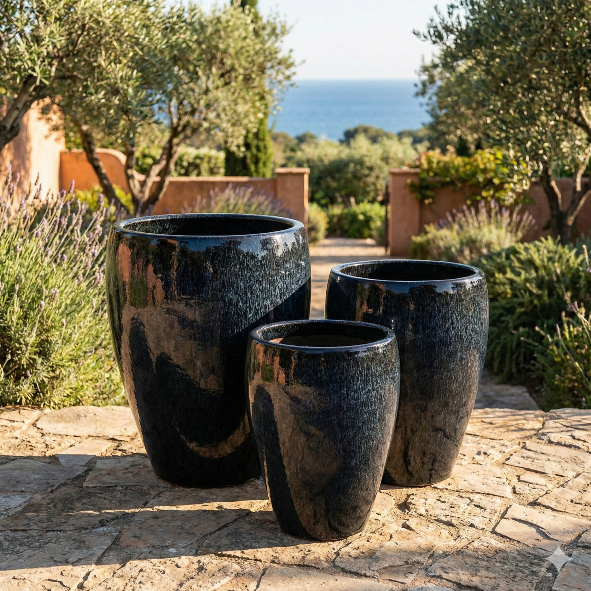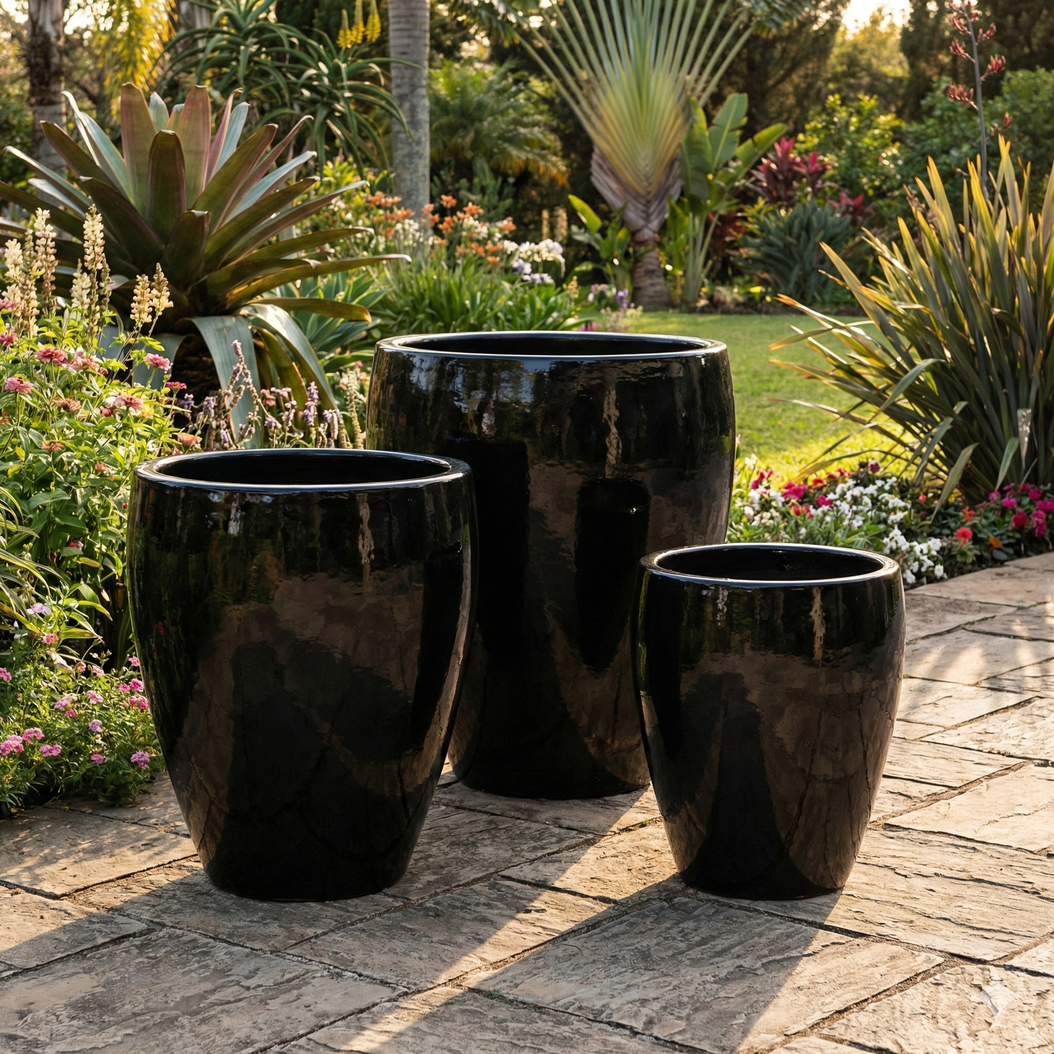 The high-gloss glaze provides a brilliant reflective quality that captures and plays with natural light throughout the day. Whether flanking an entryway or nested together in a garden corner, their clean lines and substantial presence bring an air of polished elegance to your botanical displays.