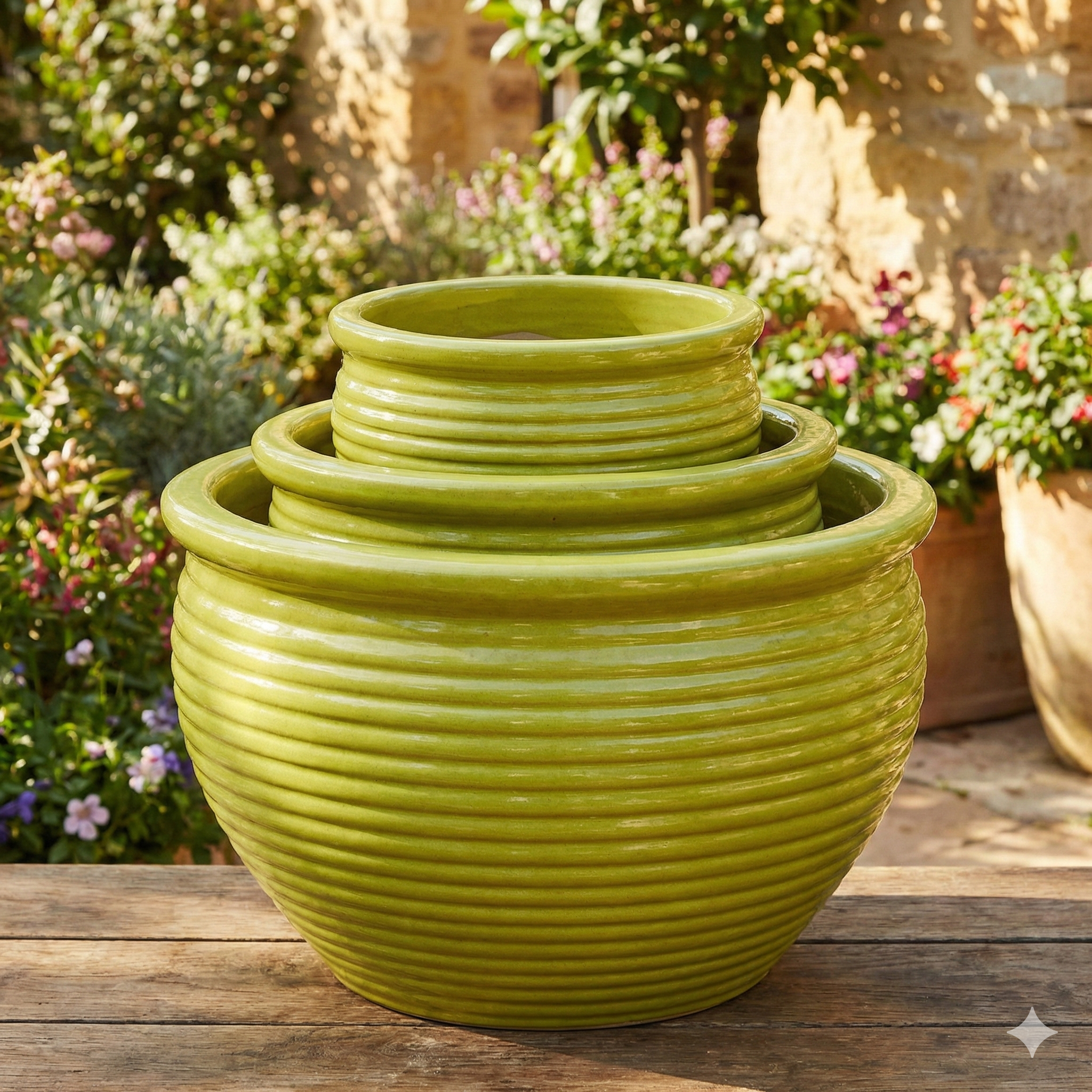 Elevate your botanical display with this collection of three handcrafted-style planters. Featuring a classic, tapered silhouette and a distinctive horizontal ribbed texture, these pots bring a sophisticated, tactile element to any space. The graduated sizing allows you to create a tiered visual arrangement on a patio, or distribute them throughout your home for a cohesive design theme.