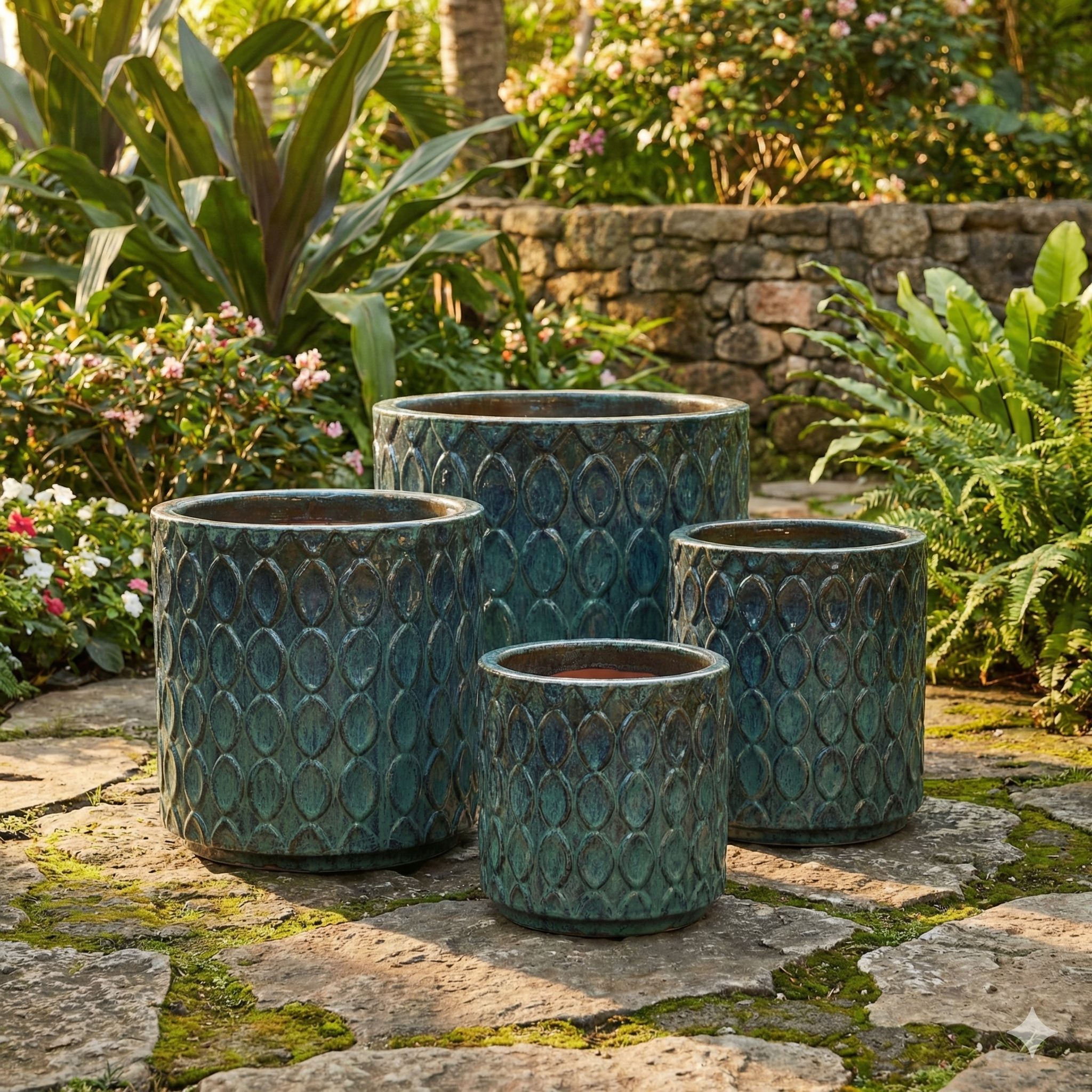 Elevate your outdoor sanctuary with this stunning collection of nested planters. Each piece features a mesmerizing, hand-applied teal glaze with deep oceanic undertones, perfectly highlighting the embossed teardrop texture that wraps around the cylindrical body. This set of four offers a graduated aesthetic, allowing you to create a tiered botanical display that feels both cohesive and custom-designed.