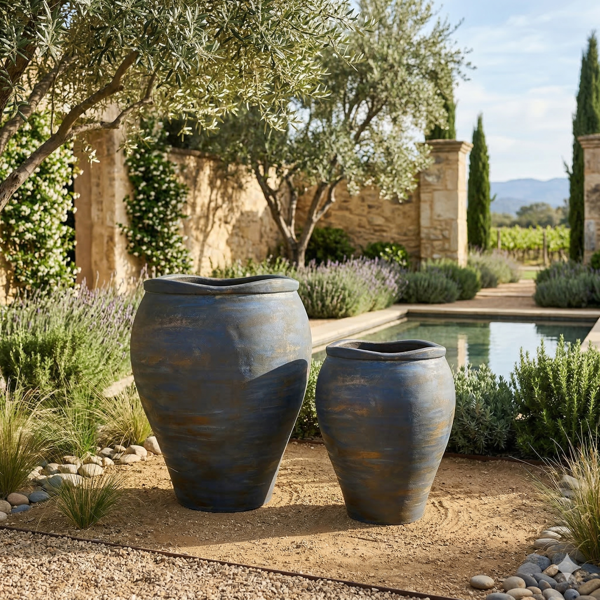 Elevate your outdoor space with this beautifully crafted ceramic planter set. Featuring a rich, weathered blue finish with subtle earthy undertones, these pots bring a refined yet natural feel to patios, garden paths, and entryways. Their soft curved silhouette and gently contoured rim create a timeless look that blends effortlessly with both modern and classic landscapes. Perfect for showcasing vibrant flowers, lush greenery, or sculptural plants, this set adds depth and character to any setting.