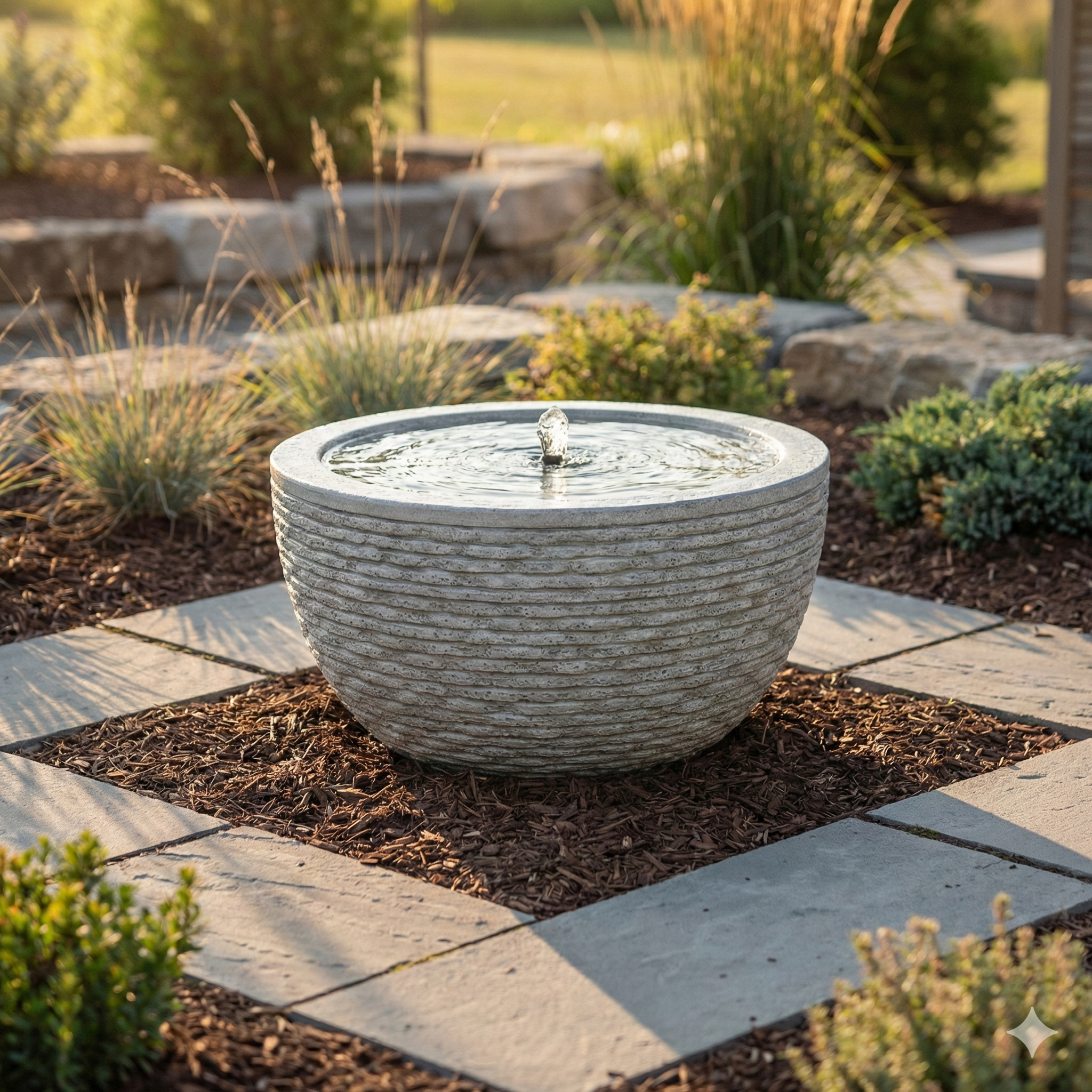 Elevate the atmosphere of your outdoor living space with the Fiberglass Fountain 1, a stunning freestanding water feature designed to bring tranquility to your home. This low-profile bowl fountain sits elegantly on any flat surface, featuring a textured, ribbed exterior that mimics the classic appeal of weathered stone. It serves as an immediate focal point, grounding your garden design with its timeless form.