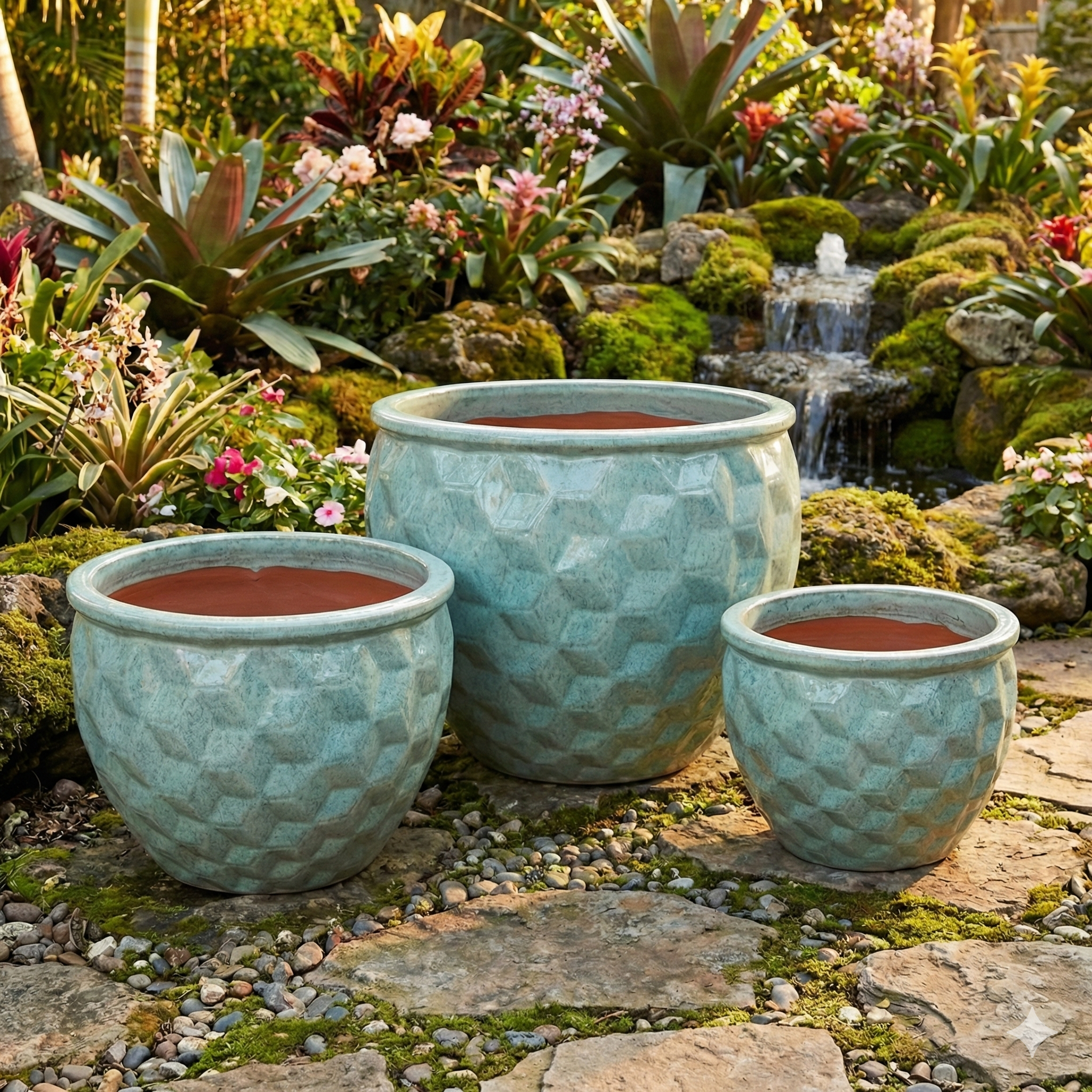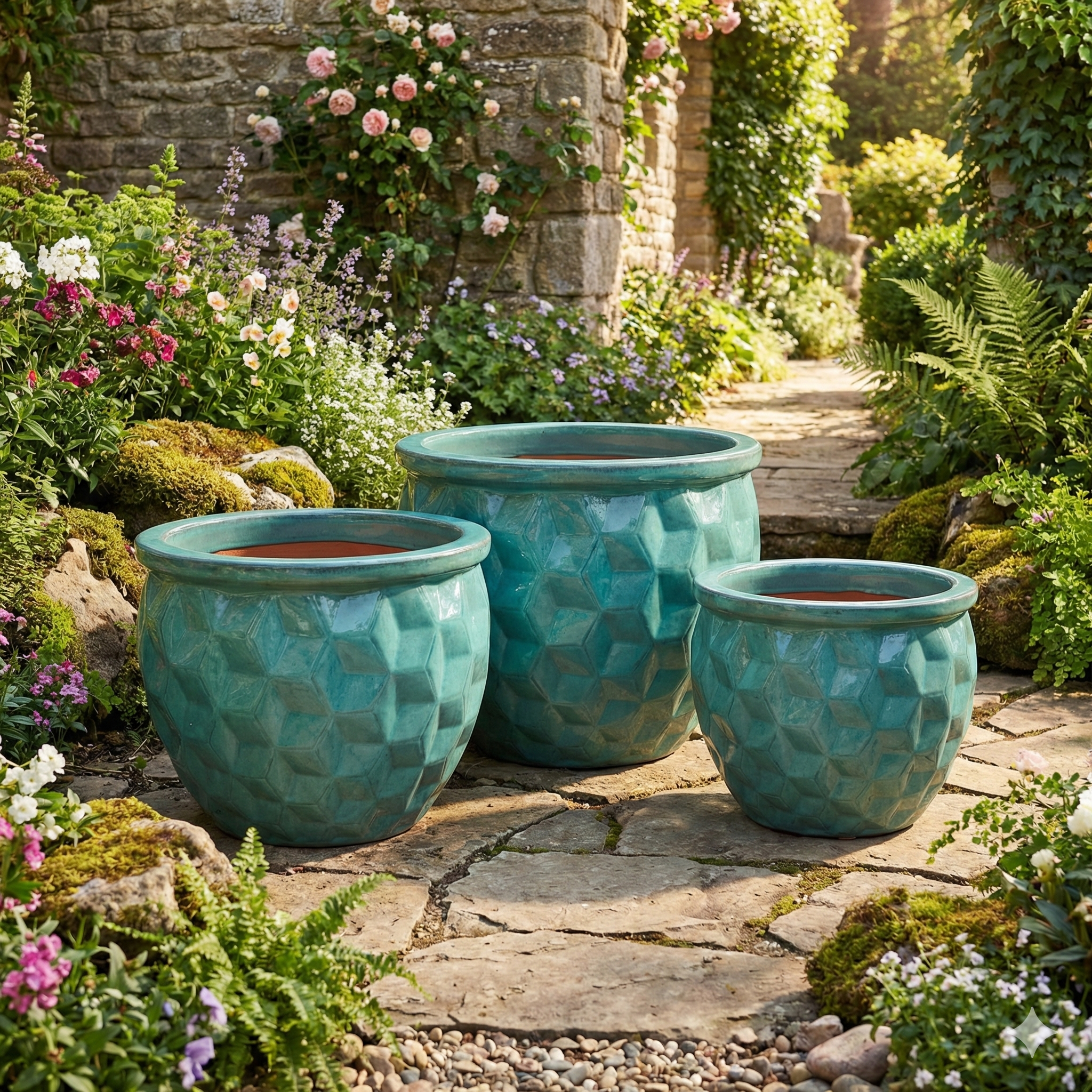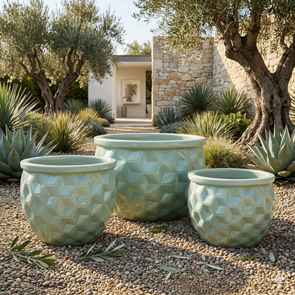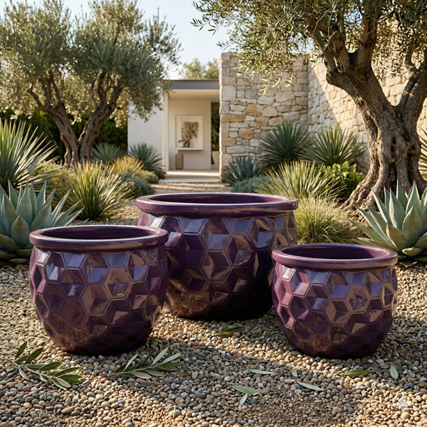 Elevate your garden’s architectural appeal with this sophisticated trio of ceramic planters. Designed with a striking balance of organic curves and sharp geometry, these vessels feature a unique faceted exterior that catches the light from every angle. The graduated sizes allow for a tiered landscape effect, making them perfect for grouping together as a focal point on a patio or nesting within a lush garden bed. Their substantial weight and wide-based silhouette provide a grounded, permanent feel to any outdoor or indoor space.