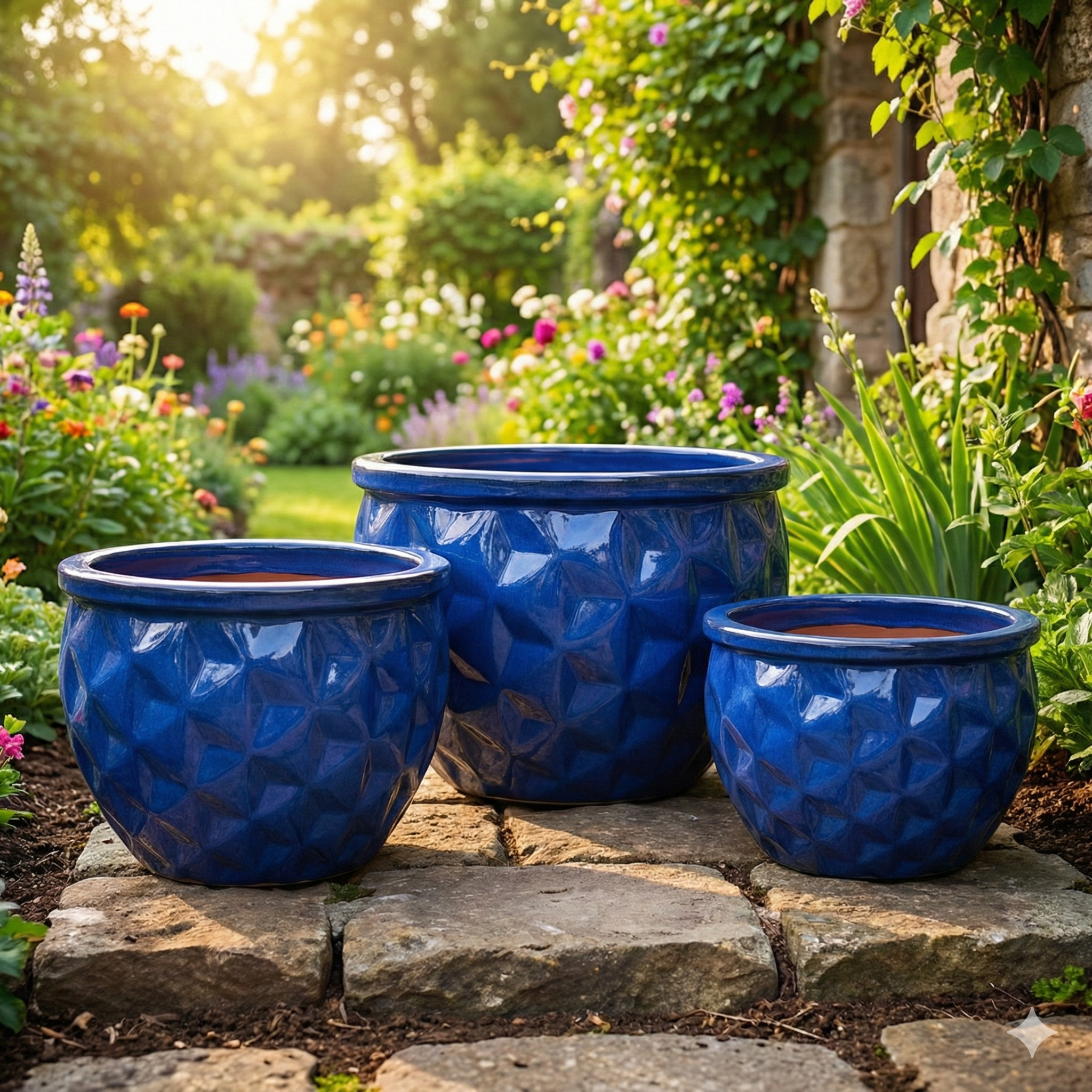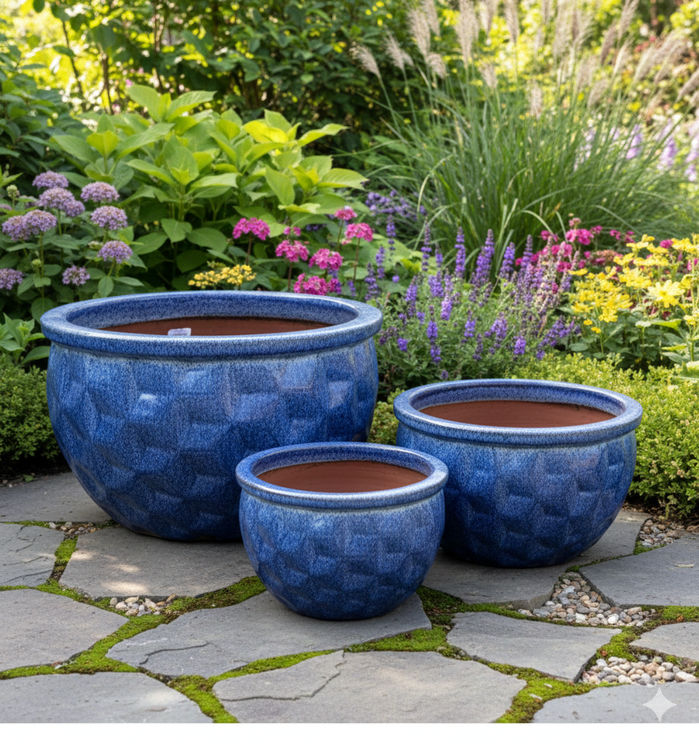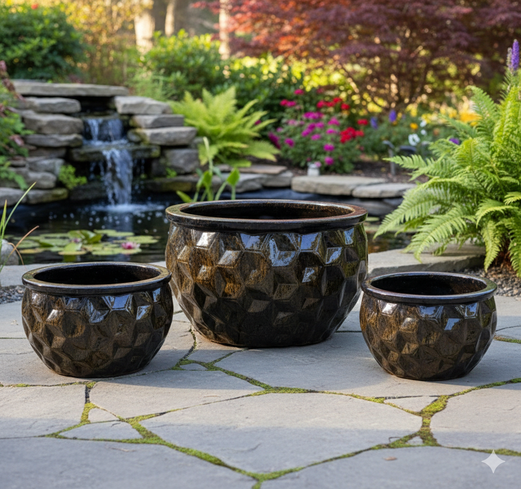 Elevate your garden’s architectural appeal with this sophisticated trio of ceramic planters. Designed with a striking balance of organic curves and sharp geometry, these vessels feature a unique faceted exterior that catches the light from every angle. The graduated sizes allow for a tiered landscape effect, making them perfect for grouping together as a focal point on a patio or nesting within a lush garden bed. Their substantial weight and wide-based silhouette provide a grounded, permanent feel to any outdoor or indoor space.