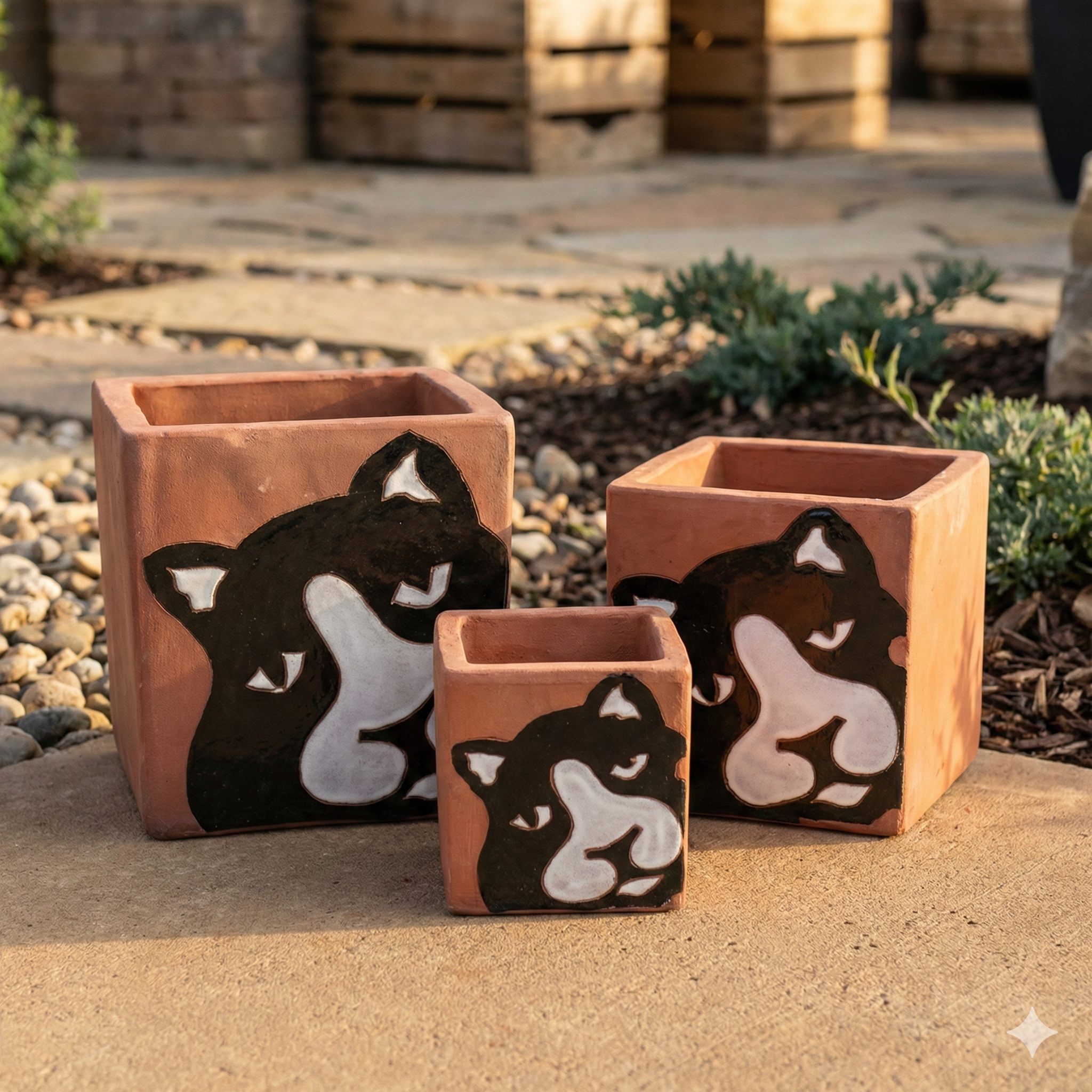 Add a touch of whimsical charm to your garden or home with our Glazed Cat Terracotta Cube. This eye-catching planter combines the timeless, earthy appeal of traditional terracotta with a bold, modern artistic flair. Featuring a hand-finished, stylized black and white cat motif, these cubes offer a unique personality that stands out in any plant collection.