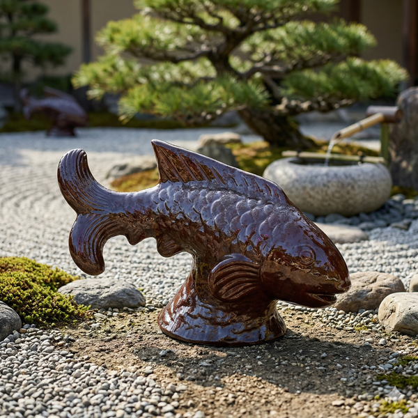 Elevate your outdoor space with this stunning ceramic fish sculpture. Finished in a rich, chocolate-brown glaze with a brilliant high-shine polish, this artistic piece captures the fluid motion of a koi. Designed to sit directly on the ground, it serves as a sophisticated focal point for Zen gardens, patios, or poolside landscapes.
