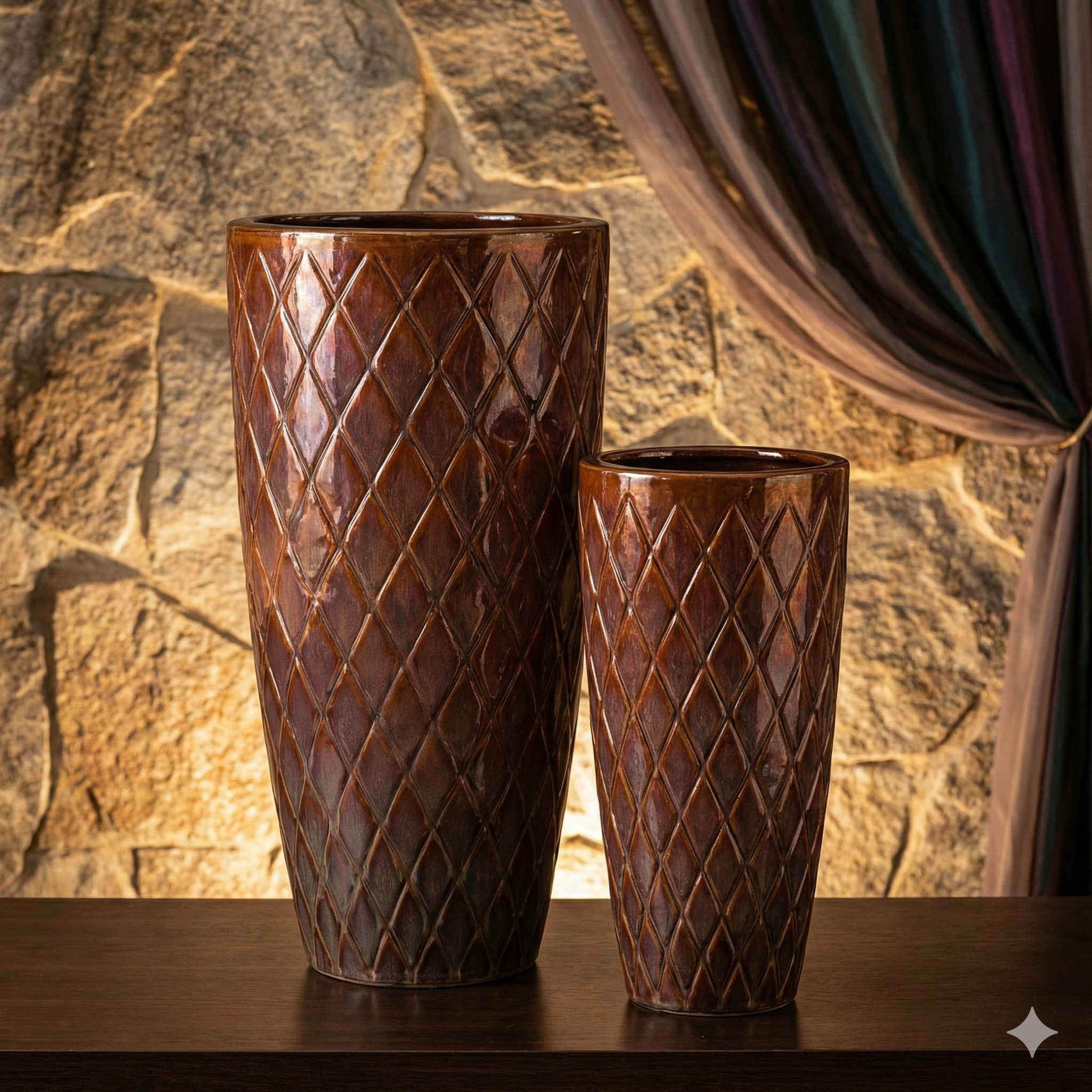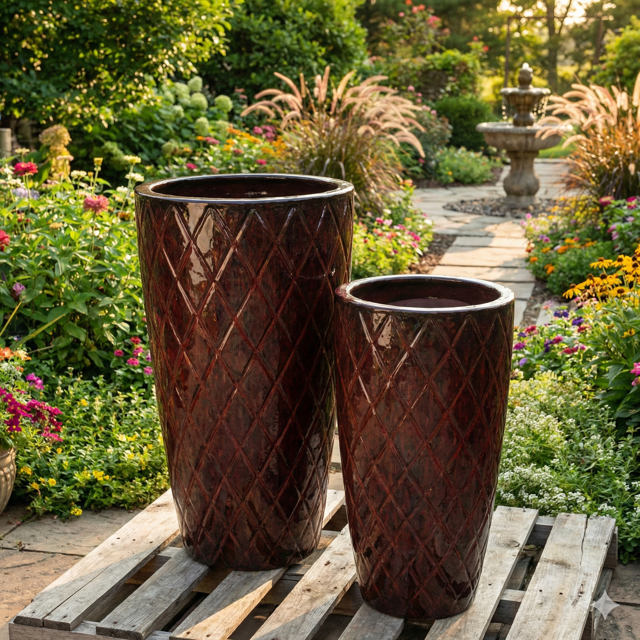 The exterior is defined by a deeply embossed diamond lattice, providing a tactile, geometric rhythm that catches the light from every angle. Whether flanking a grand entryway or nestled into a lush garden corner, these pots act as sophisticated pedestals for your favorite flora, turning simple greenery into a curated design statement.