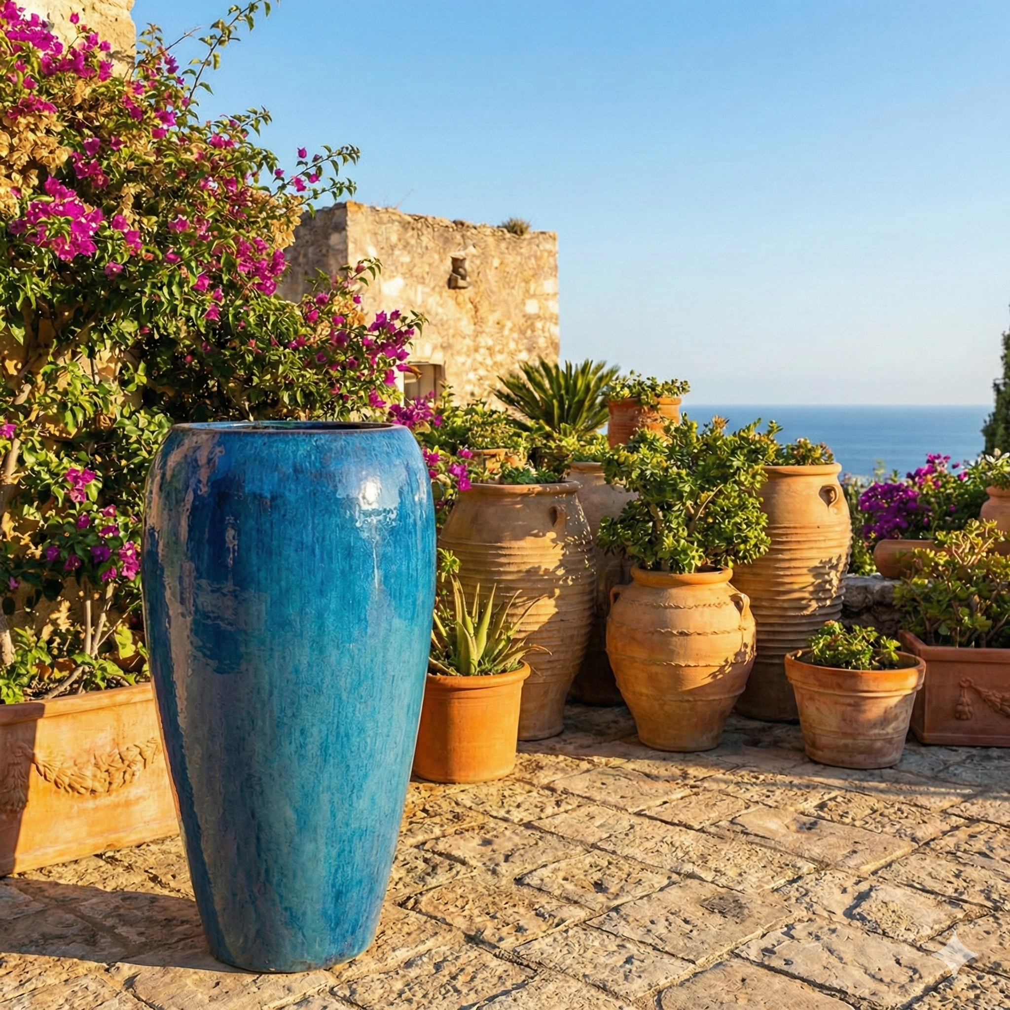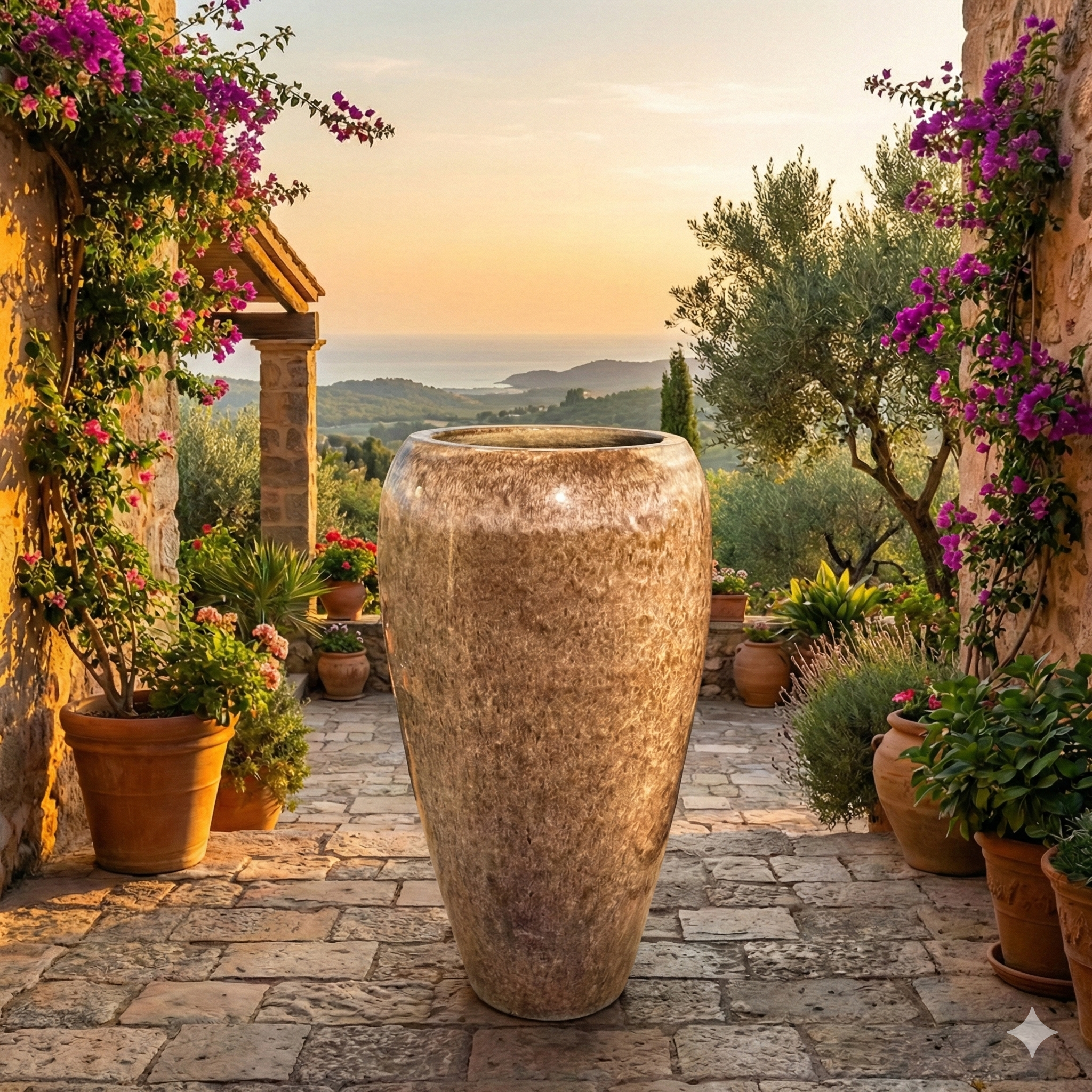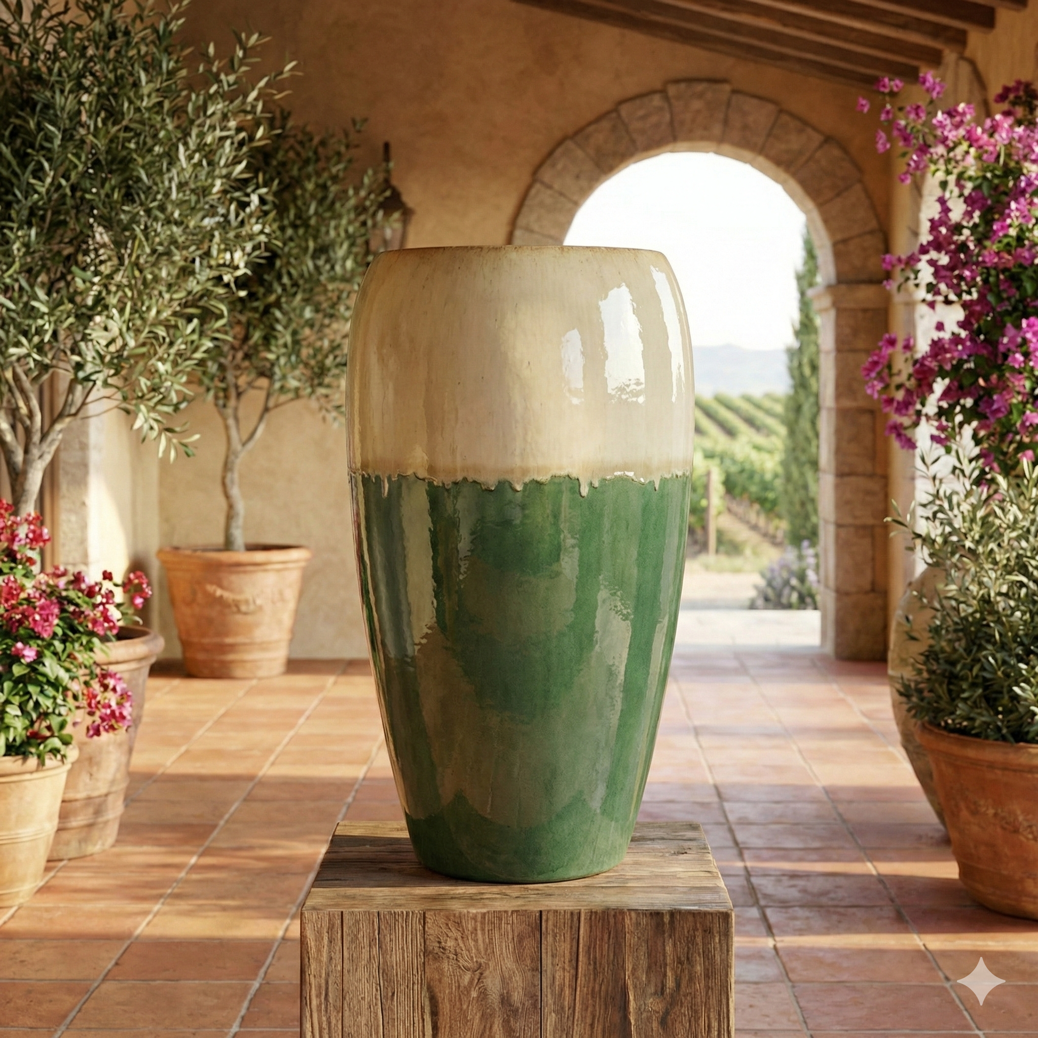 Transform your garden or patio into a Mediterranean retreat with this masterfully crafted ceramic planter. Its tall, tapered silhouette offers an architectural presence that anchors any space, whether it’s flanking a grand entryway or standing solo as a focal point.