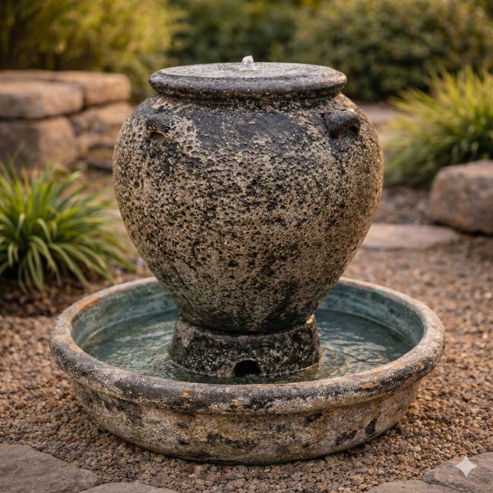 Designed to blend seamlessly with natural surroundings, this fountain serves as a striking focal point among plants, stones, and gravel. Its warm terracotta tones and weathered appearance offer a sense of history, providing a serene and inviting ambiance to your favorite outdoor retreat. It is a complete, standalone piece that effortlessly enhances the peacefulness of your landscape.