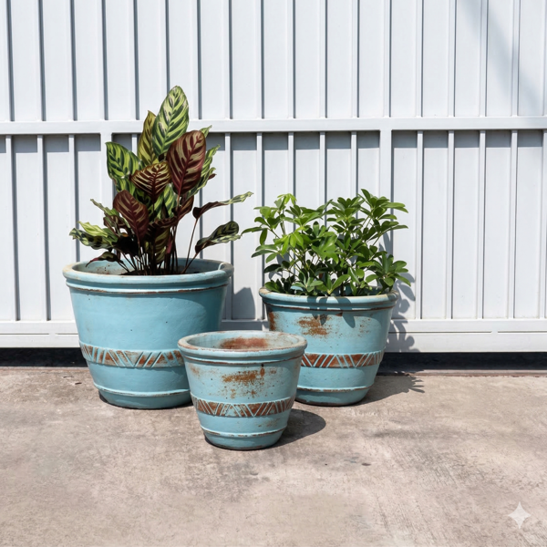 A charming set of distressed blue planter pots with a handcrafted, rustic finish that adds character to patios, porches, and garden spaces. The soft blue color paired with decorative band detailing gives these planters a timeless, coastal-inspired look that works beautifully with both tropical greenery and seasonal flowers.