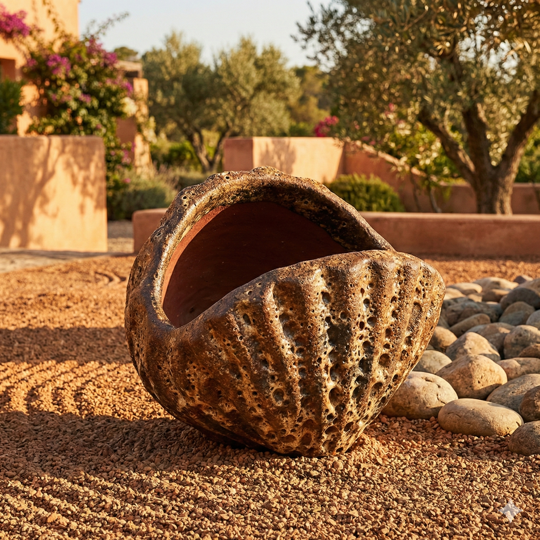 Add an element of ancient, organic beauty to your outdoor sanctuary with this striking Sculptural Shell Planter. Crafted from substantial ceramic, the planter is defined by its aggressively textured, heavily pitted surface that mimics the appearance of weathered coral or aged volcanic rock found along a rugged coastline. The rich, multi-tonal brown glaze deepens into the recesses, creating dramatic shadows and a truly rustic, tactile finish. Its unique, open-mouthed clamshell shape makes it a magnificent focal point for a Mediterranean terrace, desert landscape, or coastal patio, providing the perfect vessel for trailing succulents, ornamental grasses, or sculptural cacti.