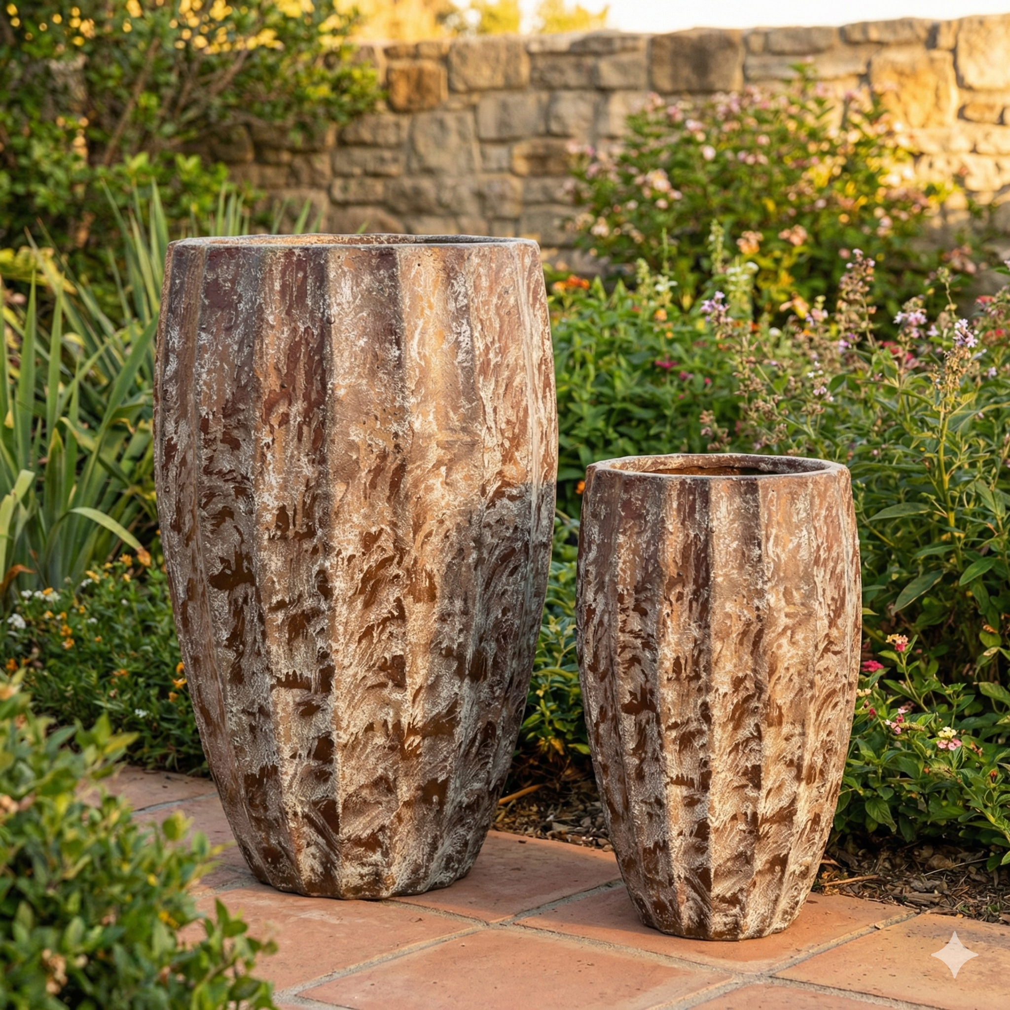 Its vertical fluting creates a striking play of light and shadow, offering a modern silhouette that feels grounded in natural texture. Whether you’re flanking a grand entrance or adding depth to a garden corner, these planters provide a sophisticated, high-end backdrop for everything from architectural grasses to vibrant perennials.