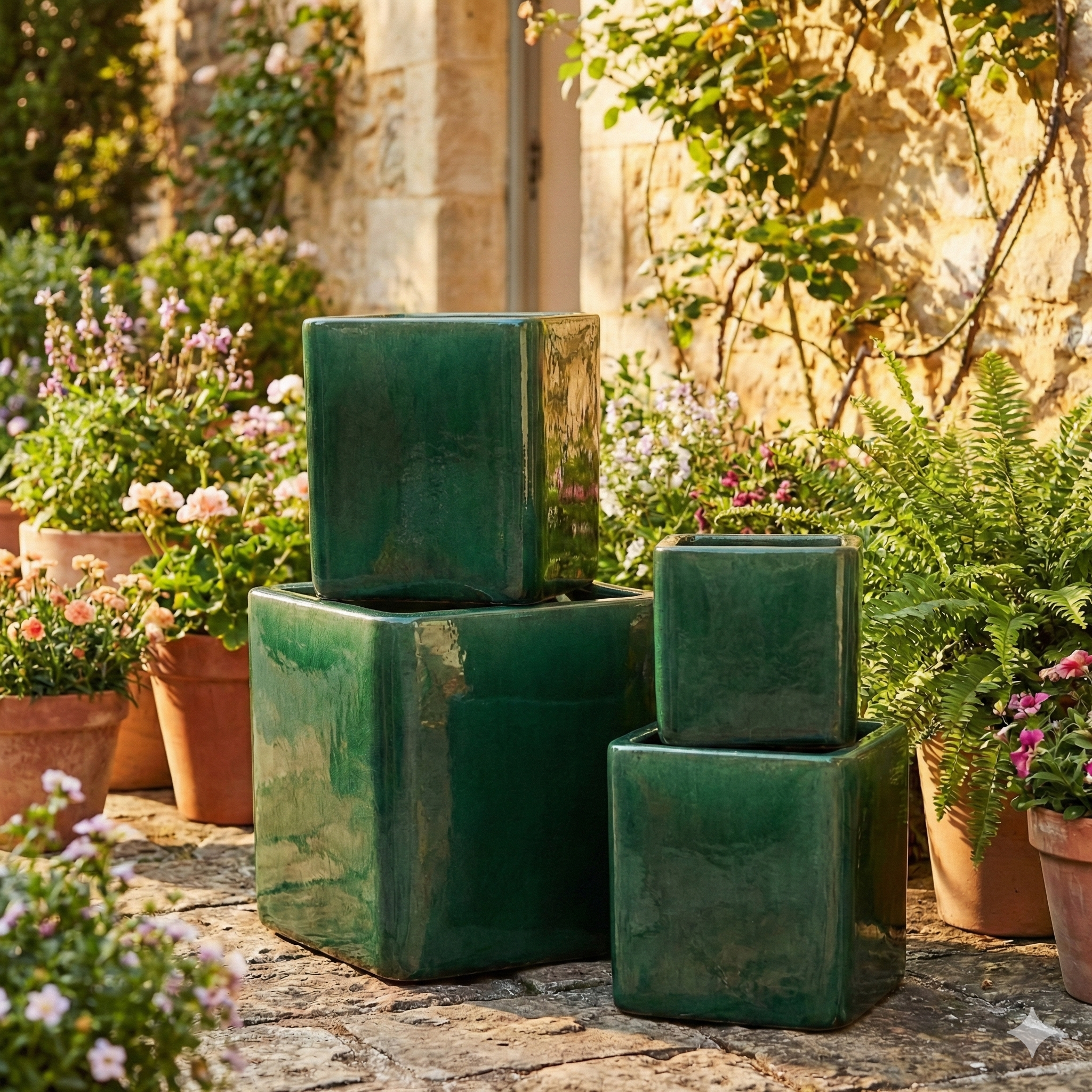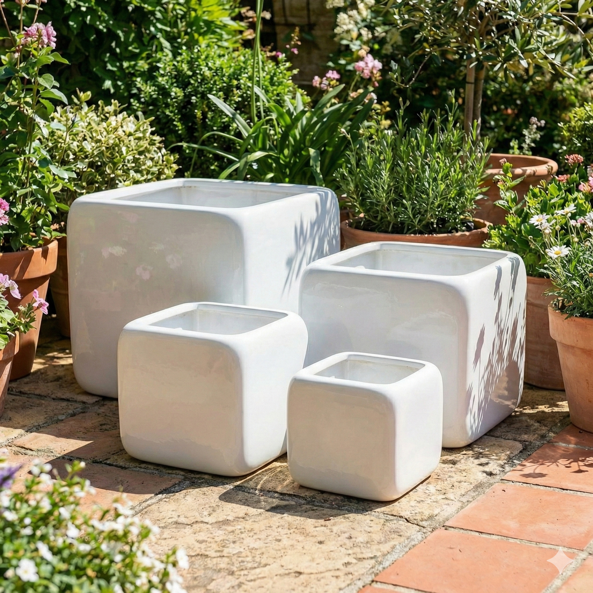 Elevate your botanical arrangements with this striking set of four graduated planters. Crafted from durable, high-quality ceramic, each pot features a sleek cube silhouette that brings a modern geometric edge to any space. The brilliant, high-gloss glaze finish reflects light beautifully, adding a touch of sophistication to your decor. With varying sizes ranging from small to extra-large, this versatile collection allows for dynamic clustering as a centerpiece or spreading out as individual accents across your patio, balcony, or living room. They are robust enough for outdoor use while remaining elegant enough for interior plant displays.