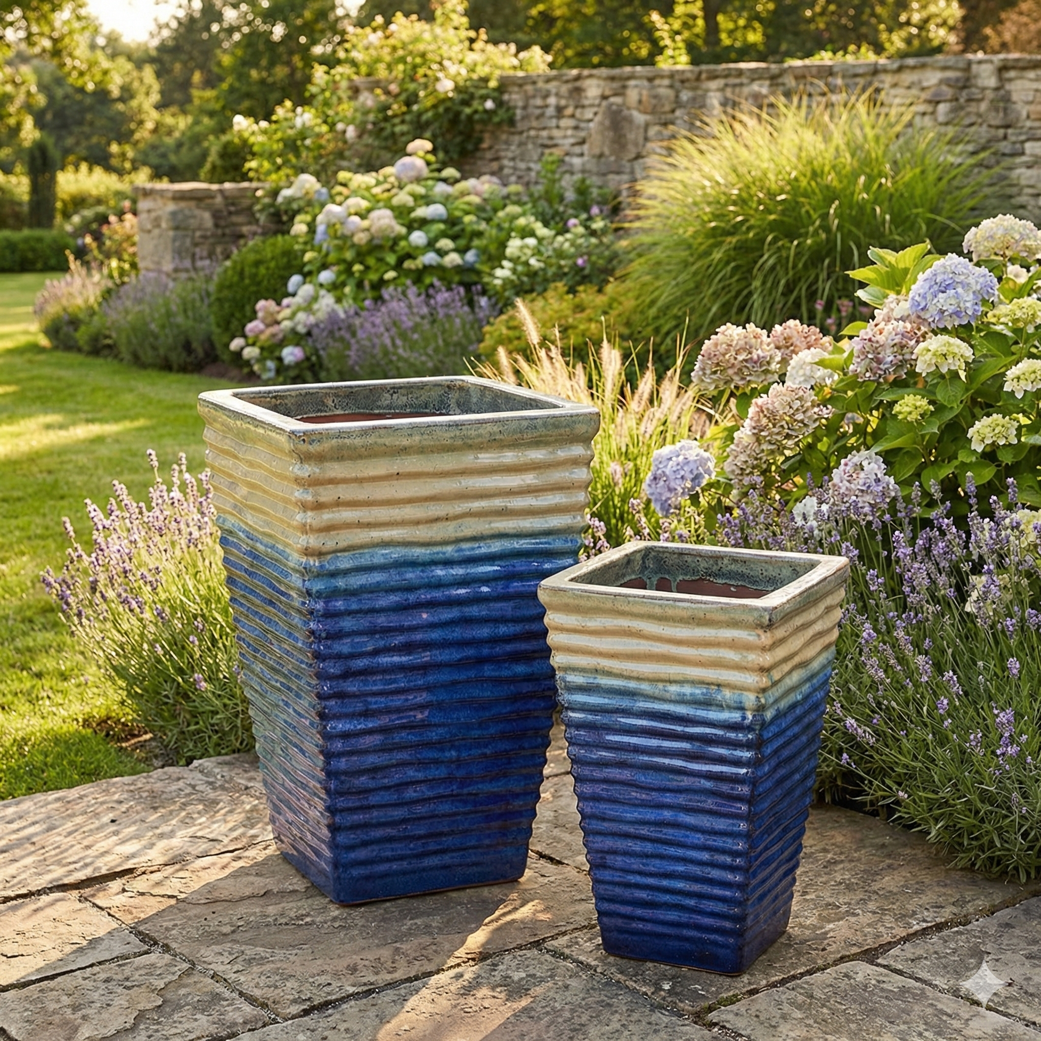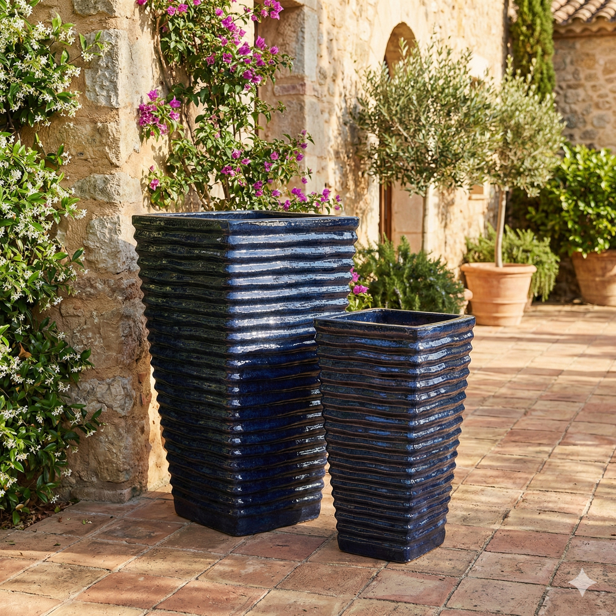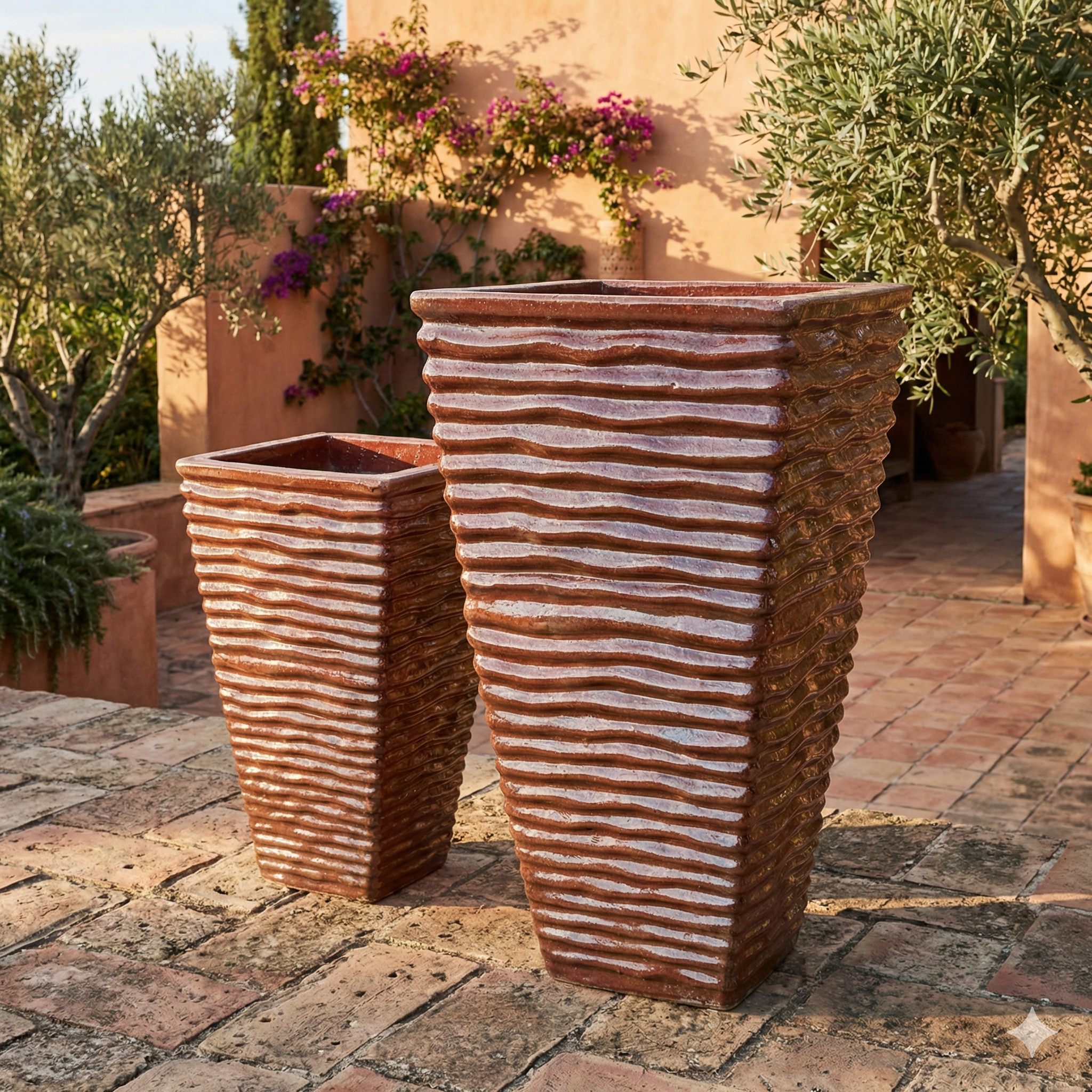 These planters are designed to bring a sophisticated, architectural element to your home or garden. Featuring a striking square tapered silhouette, each pot is defined by a deep, horizontal wave texture that creates a dynamic play of light and shadow. Crafted with a premium glazed finish, this set of two offers a graduated scale that is perfect for creating tiered botanical displays or flanking an entryway with professional-grade style.