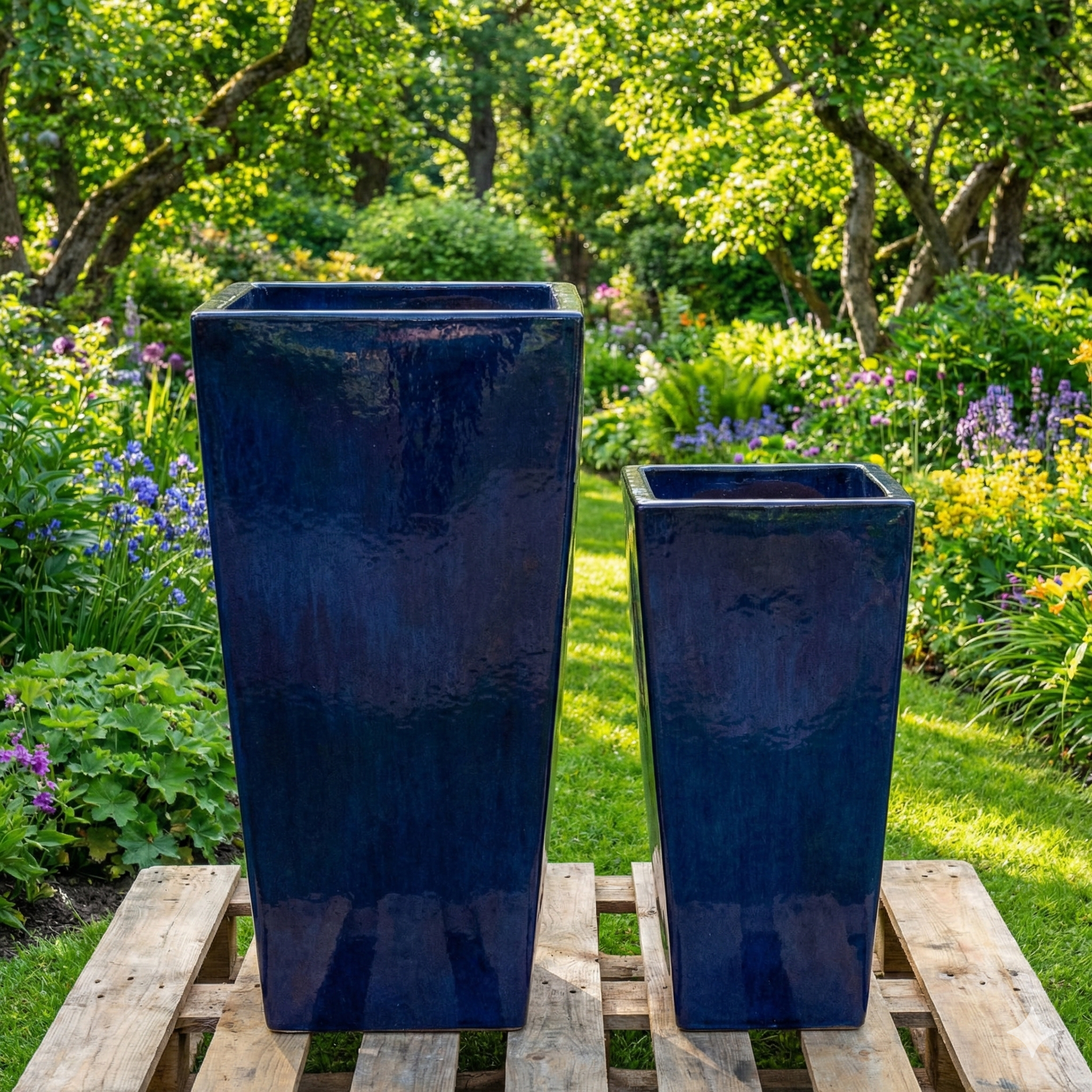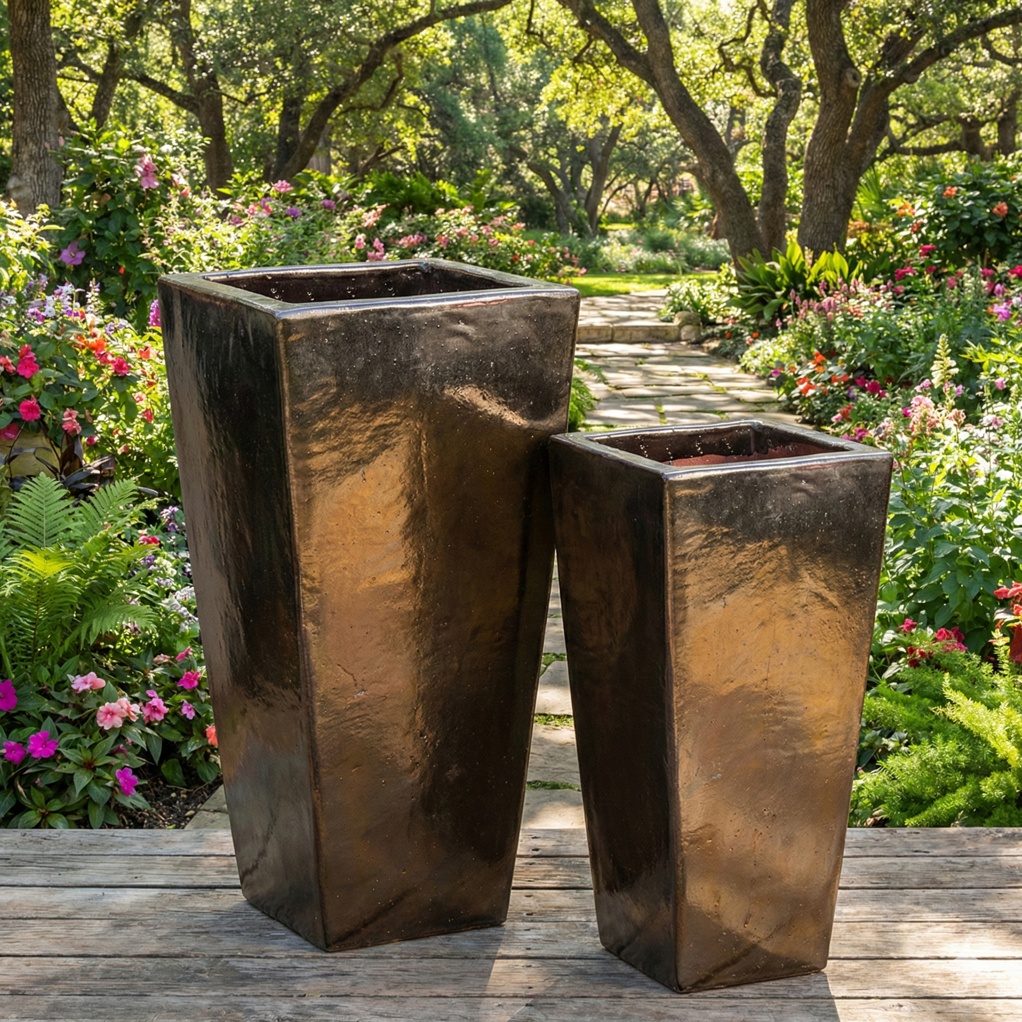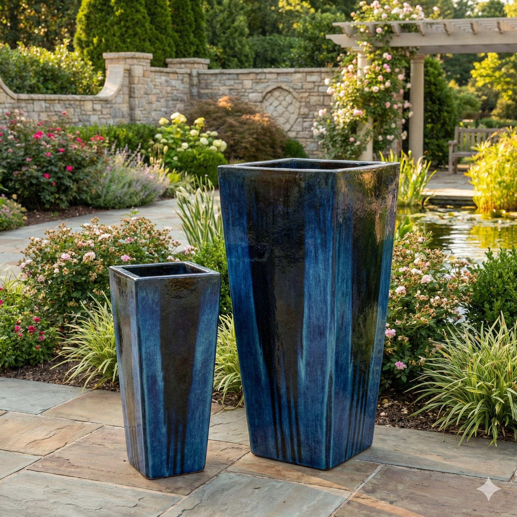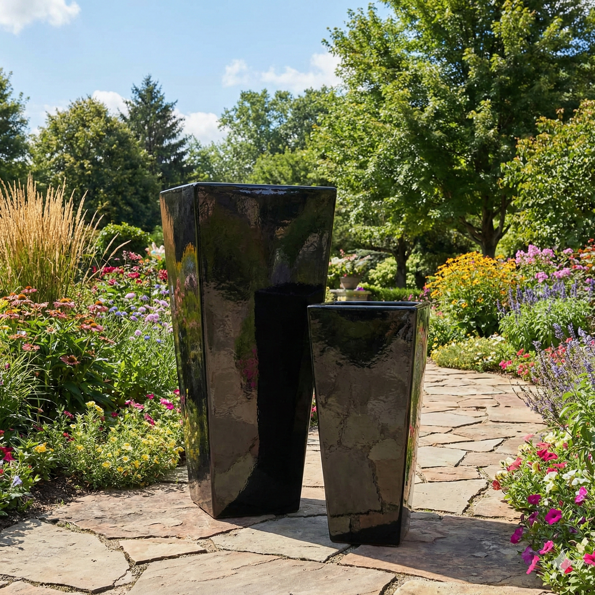 This set of premium ceramic planters combines a sleek, modern silhouette with artisanal craftsmanship to elevate any landscape or interior. Each piece is handcrafted from high-quality clay and finished with a rich, multi-layered glaze that catches the light from every angle. The dramatic, tapered square design provides striking vertical interest, making these pots perfect for framing entryways or adding a sophisticated focal point to garden corners. Designed for both beauty and longevity, these substantial planters offer a timeless aesthetic that complements a wide range of architectural styles.