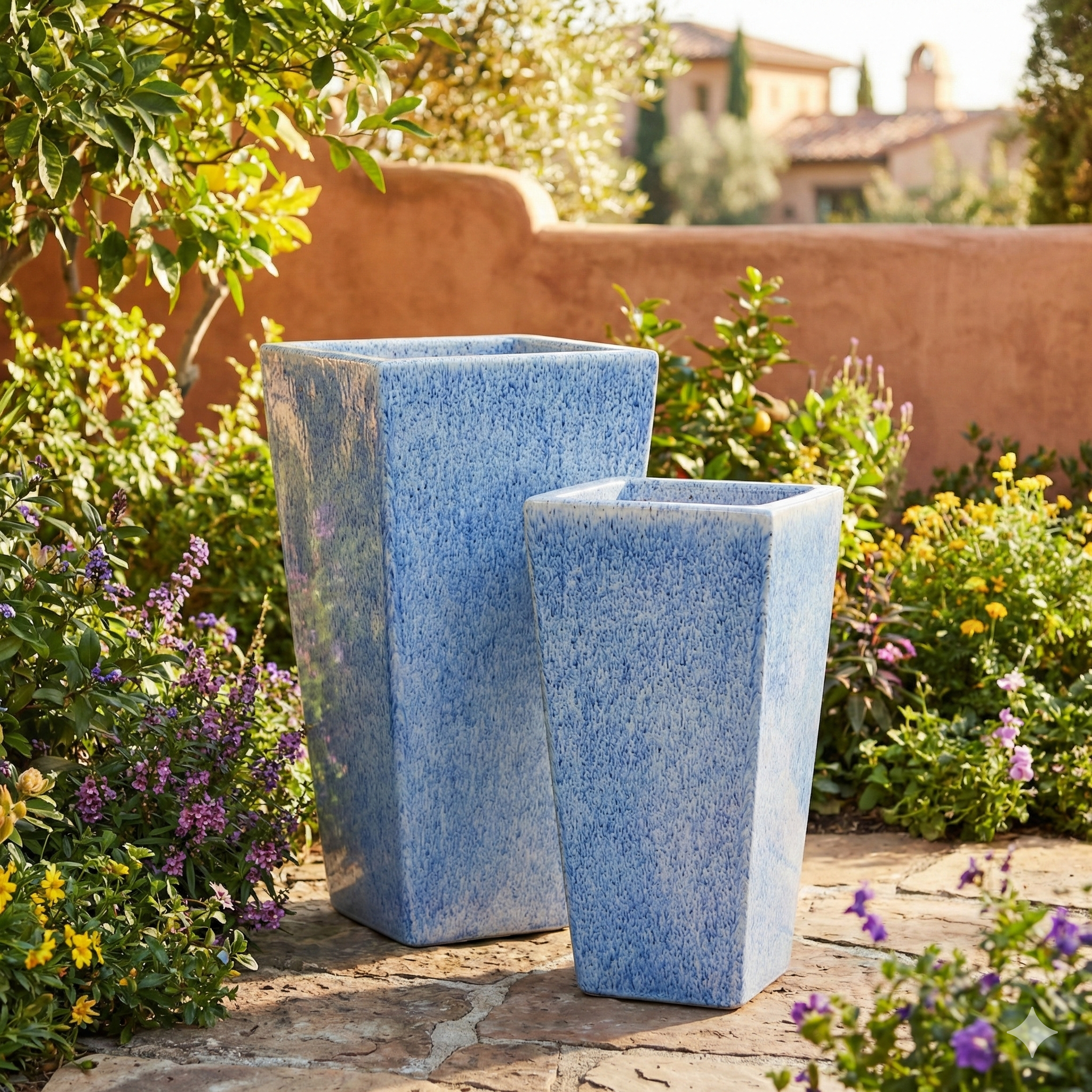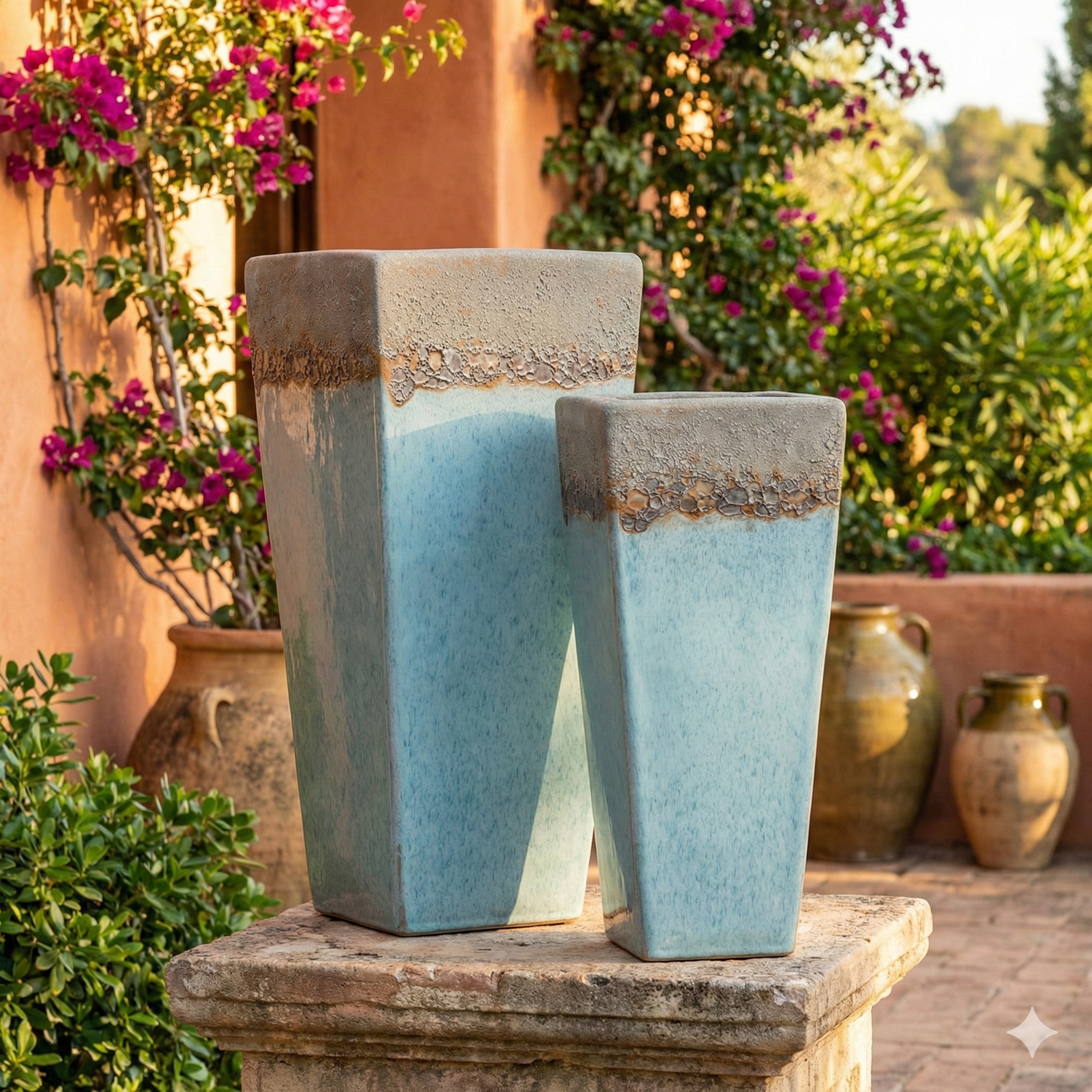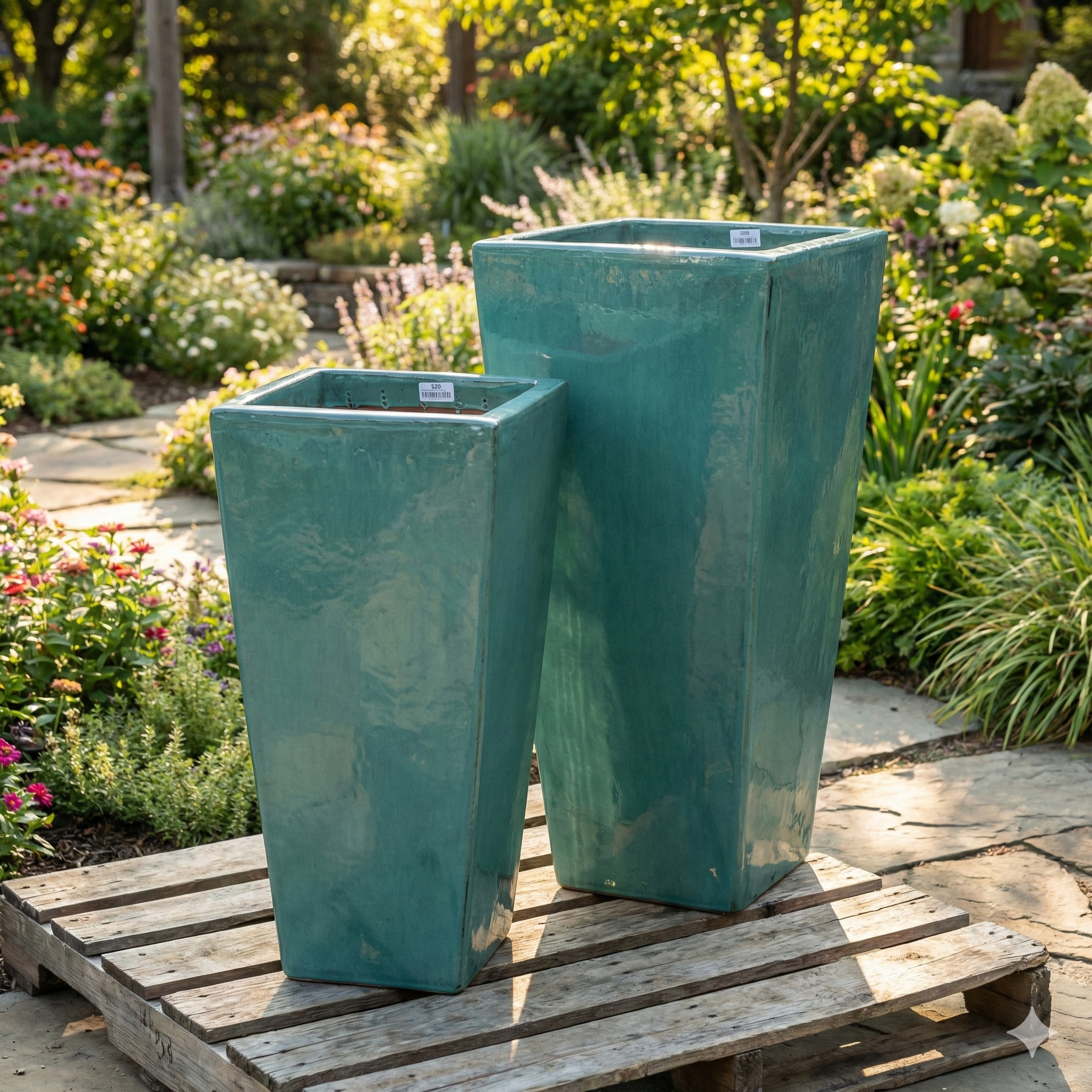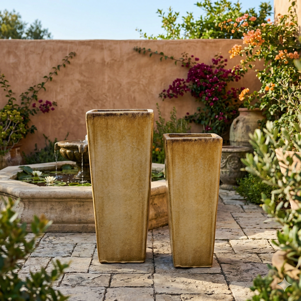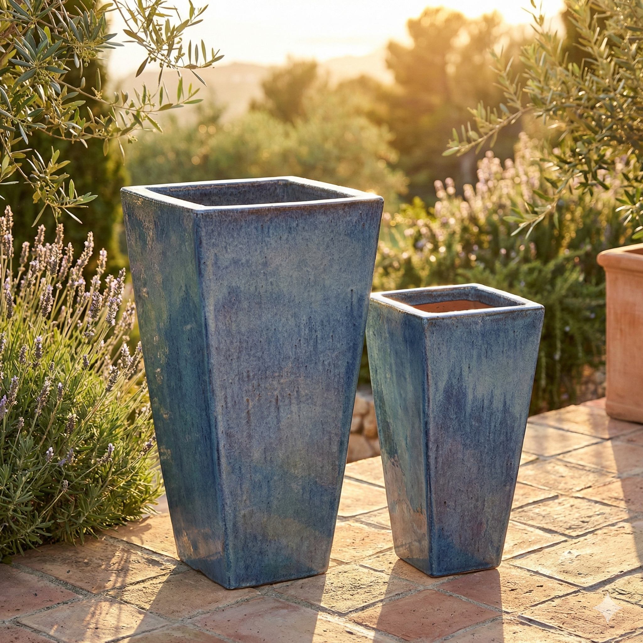 This set of premium ceramic planters combines a sleek, modern silhouette with artisanal craftsmanship to elevate any landscape or interior. Each piece is handcrafted from high-quality clay and finished with a rich, multi-layered glaze that catches the light from every angle. The dramatic, tapered square design provides striking vertical interest, making these pots perfect for framing entryways or adding a sophisticated focal point to garden corners. Designed for both beauty and longevity, these substantial planters offer a timeless aesthetic that complements a wide range of architectural styles.