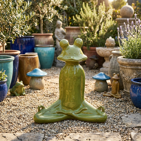 Bring a sense of playful tranquility to your outdoor space with this charming ceramic garden statue. Featuring a unique, stylized silhouette in a vibrant moss-green glaze, this meditative frog is designed to stand out amongst your greenery and garden pottery.